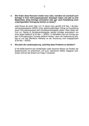 2 3. Wie finden diese Personen wieder neue Jobs, nachdem sie eventuell auch Einträge in ihren Führungszeugnissen deswegen haben und gibt es eine Möglichkeit, diese Einträge einzusehen oder ggf. nach Feststellung einer unsachgemäßen Eintragung löschen zu lassen? Jede Person ab einem Alter von 14 Jahren kann gemäß § 30 Abs. 1 Bundes- zentralregistergesetz (BZRG) einen gebührenpflichtigen Antrag auf Ausstellung eines Führungszeugnisses beim Bundeszentralregister stellen. Nach Ablauf der Frist zur Tilgung im Bundeszentralregister werden Einträge automatisch von Amts wegen gelöscht (§ 45 Abs. 1. BZRG). In Härtefällen kann ein Eintrag aus dem Führungszeugnis vorzeitig gelöscht werden, wenn die Vollstreckung erle- digt ist und das öffentliche Interesse an der Anordnung nicht entgegensteht (§ 49 Abs. 1 BZRG). 4. Wie plant die Landesregierung, zukünftig diese Probleme zu beheben? § 164 StGB bestimmt das Verdächtigen wider besseres Wissen als Straftat, der staatlicherseits mit präventiven und auch repressiven Mitteln begegnet wird. Zudem wird auf die Antwort auf Frage 3 verwiesen.