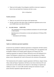 Following the presentation of the Pact, we might come back to this issue in one of our future meetings. 5. Update on readmission agreement negotiations (15.30-16.30) - Information by the Commission Objective To update delegates on the ongoing negotiations as regards readmission agreements with third countries Handling No difficulties foreseen. Stress the importance of cooperation with third countries in the area of return and readmission. Give the floor to Commission for the update. Speaking points Dear colleagues, as you are well aware, the effectiveness of the EU return policy and the return rates depend a lot on the cooperation with third countries in the area of return and readmission. While all states have an international obligation to readmit their own nationals, in practice there are many impediments which hinder the efficient implementation of this obligation. To improve the situation, a number of EU readmission agreements and arrangements with third countries have been concluded. Recently, on 8 January 2020 we signed the EU readmission agreement with Belarus, which is now waiting for the European Parliament's consent. I would now like to invite Commission colleagues to update us as regards negotiations on readmission agreements with other third countries. Commission, you have the floor. [floor to COM] 6