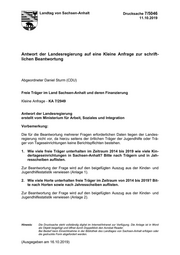 Landtag von Sachsen-Anhalt Drucksache 7/5046 11.10.2019 Antwort der Landesregierung auf eine Kleine Anfrage zur schrift- lichen Beantwortung Abgeordneter Daniel Sturm (CDU) Freie Träger im Land Sachsen-Anhalt und deren Finanzierung Kleine Anfrage - KA 7/2949 Antwort der Landesregierung erstellt vom Ministerium für Arbeit, Soziales und Integration Vorbemerkung: Die für die Beantwortung mehrerer Fragen erforderlichen Daten liegen der Landes- regierung nicht vor, da hierzu seitens der örtlichen Träger der Jugendhilfe oder Trä- ger von Tageseinrichtungen keine Berichtspflichten bestehen. 1. Wie viele freie Träger unterhalten im Zeitraum 2014 bis 2019 wie viele Kin- dertageseinrichtungen in Sachsen-Anhalt? Bitte nach Trägern und in Jah- resscheiben auflisten. Zur Beantwortung der Frage wird auf den beigefügten Auszug aus der Kinder- und Jugendhilfestatistik verwiesen (Anlage 1). 2. Wie viele Horte unterhalten freie Träger im Zeitraum von 2014 bis 2019? Bit- te nach Horten sowie nach Jahresscheiben auflisten. Zur Beantwortung der Frage wird auf den beigefügten Auszug aus der Kinder- und Jugendhilfestatistik verwiesen (Anlage 2). Hinweis: Die Drucksache steht vollständig digital im Internet/Intranet zur Verfügung. Die Anlage ist in Word als Objekt beigefügt und öffnet durch Doppelklick den Acrobat Reader. Bei Bedarf kann Einsichtnahme in der Bibliothek des Landtages von Sachsen-Anhalt erfolgen oder die gedruckte Form abgefordert werden. (Ausgegeben am 16.10.2019)