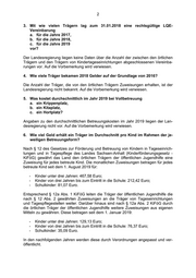 2 3. Mit wie vielen Trägern lag zum 31.01.2018 eine rechtsgültige LQE- Vereinbarung a. für die Jahre 2017, b. für die Jahre 2018, c. für die Jahre 2019 vor? Der Landesregierung liegen keine Daten über die Anzahl der zwischen den örtlichen Trägern und den Trägern von Kindertageseinrichtungen abgeschlossenen Vereinba- rungen vor. Auf die Vorbemerkung wird verwiesen. 4. Wie viele Träger bekamen 2018 Gelder auf der Grundlage von 2016? Die Anzahl der Träger, die von den örtlichen Trägern Zuweisungen erhalten, ist der Landesregierung nicht bekannt. Auf die Vorbemerkung wird verwiesen. 5. Was kostet durchschnittlich im Jahr 2019 bei Vollbetreuung a. ein Krippenplatz, b. ein Kitaplatz, c. ein Hortplatz? Angaben zu den durchschnittlichen Betreuungskosten im Jahr 2019 liegen der Lan- desregierung nicht vor. Auf die Vorbemerkung wird verwiesen. 6. Wie viel Geld erhält ein Träger im Durchschnitt pro Kind im Rahmen der je- weiligen Betreuungsform? Nach § 12 des Gesetzes zur Förderung und Betreuung von Kindern in Tageseinrich- tungen und in Tagespflege des Landes Sachsen-Anhalt (Kinderförderungsgesetz - KiFöG) gewährt das Land den örtlichen Trägern der öffentlichen Jugendhilfe eine Zuweisung für jedes betreute Kind. Die monatlichen Zuweisungen betragen für jedes betreute Kind seit dem 1. August 2019 für: - Kinder unter drei Jahren: 467,58 Euro; - Kinder von drei Jahren bis zum Eintritt in die Schule: 212,42 Euro; - Schulkinder: 81,07 Euro. Entsprechend § 12a Abs. 1 KiFöG leiten die Träger der öffentlichen Jugendhilfe die nach § 12 Abs. 2 gewährten Zuweisungen an die Träger von Tageseinrichtungen und Tagespflegestellen weiter. Darüber hinaus sind nach § 12a Abs. 2 KiFöG durch die örtlichen Träger der öffentlichen Jugendhilfe weitere Zuweisungen aus eigenen Mitteln zu gewähren. Diese betragen seit dem 1. Januar 2019: - Kinder unter drei Jahren: 129,13 Euro; - Kinder von drei Jahren bis zum Eintritt in die Schule: 76,37 Euro; - Schulkinder: 35,09 Euro. In den nachfolgenden Jahren werden diese durch Verordnungen angepasst und ver- öffentlicht.
