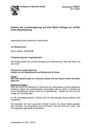 Landtag von Sachsen-Anhalt Drucksache 7/5337 27.11.2019 Antwort der Landesregierung auf eine Kleine Anfrage zur schrift- lichen Beantwortung Abgeordnete Sarah Sauermann (fraktionslos) Jan Böhmermann Kleine Anfrage - KA 7/3149 Vorbemerkung des Fragestellenden: Die Anfrage bezieht sich auf den Hintergrund Jan Böhmermann. Was darf Satire und was nicht? Antwort der Landesregierung erstellt von der Staatskanzlei und Ministerium für Kultur Frage 1 Wie viele Kabarett gibt es in Sachsen-Anhalt und wer stimmt hierfür die Spiel- pläne ab? Antwort zu Frage 1: Über die Anzahl der Kabaretts im Lande führt die Landesregierung keine statistische Erhebung. Neben den professionellen Veranstaltern gibt es solche im Bereich der Freien Darstellenden Künste sowie der Amateurtheater - oftmals mit einer Schnitt- menge zum Sprechtheater. An den vertragsgebundenen Theatern wird die eigenständige Sparte Kabarett nicht vorgehalten. Die Spielpläne der oben genannten Anbieter werden von diesen selbst gestaltet, denn sie fallen, wie die gesamte Kunst und Kultur, unter die durch Art. 5 Abs. 3 des Grundgesetzes geschützte Kulturfreiheit. (Ausgegeben am 29.11.2019)