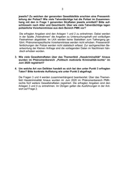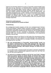 3 jeweils? Zu welchen der genannten Gewaltdelikte erschien eine Pressemit- teilung der Polizei? Wie viele Tatverdächtige hat die Polizei im Zusammen- hang mit den in Frage 1 genannten Straftaten jeweils ermittelt? Bitte auf- schlüsseln nach Alter und Geschlecht. Über wie viele Tatverdächtige lagen polizeiliche Vorerkenntnisse aus dem Bereich PMK vor? Die erfragten Angaben sind den Anlagen 1 und 2 zu entnehmen. Dabei werden in der Spalte „Festnahmen“ die Angaben zu Untersuchungshaft und vorläufigen Festnahmen abgebildet. Im LKA werden keine Statistiken zum Tathergang ge- führt. Phänomenspezifische Vorerkenntnisse werden nicht erhoben. Presseveröf- fentlichungen der Polizei werden nicht statistisch erfasst. Zur sachgerechten Be- antwortung der Kleinen Anfrage sind die vorliegenden Daten im Nachhinein hän- disch erhoben worden. 3. Wie viele Gewaltstraftaten über das Themenfeld „Hasskriminalität“ hinaus wurden im Phänomenbereich „Politisch motivierte Kriminalität-rechts“ im Juni 2020 registriert? 4. Um welche Art von Delikten handelt es sich bei den unter Punkt 3 erfragten Taten? Bitte konkrete Auflistung wie unter Punkt 2 abgefragt. Die Fragen 3 und 4 werden zusammenhängend beantwortet. Über das Themen- feld Hasskriminalität hinaus wurden im Juni 2020 im Phänomenbereich PMK- rechts fünf weitere Gewaltstraftaten registriert. Die erfragten Angaben sind den Anlagen 3 und 4 zu entnehmen. Im Übrigen gelten die Ausführungen in der Ant- wort auf Frage 2.