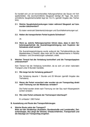 4 9. Hatte der Fahrer des Ferkeltransportes einen gültigen Sachkundenach- weis? Wie viele Jahre Berufserfahrung hat der Fahrer des Transportfahr- zeuges und welcher Nationalität gehört er an? Ja, der Fahrer verfügt über einen gültigen Nachweis. Er fährt Viehtransporte seit den 80er Jahren. Die Staatsangehörigkeit des Fahrers ist deutsch. 10. Mit welchen Klimakontrollgeräten ist das Transportfahrzeug ausgestattet? Das Transportfahrzeug ist nicht mit einem Klimakontrollgerät ausgestattet, da es ausschließlich bei nationalen Transporten unter 8 Stunden zum Einsatz kommt. 10.1 Ist die Temperatur pro Stockwerk des Transportfahrzeuges separat einstell- und ablesbar? 10.2 Werden die Alarm- und Störungsmeldungen auf dem Panel der Zug- maschine angezeigt? 10.3 Wenn ja, wurden im Bordcomputer Störungen des Fahrzeugklimas während der Transportzeit aufgezeichnet? 10.4 Welcher Art und Weise waren die Störungen und was wurde dagegen unternommen? Siehe Antwort 10. C. Festgestellter Sachstand 11. Wie viele transportierte Ferkel waren tatsächlich am Zielbetrieb verendet? 190 Ferkel waren verendet. 12. Wie viele Ferkel überlebten den Transport und wurden anschließend zur Aufzucht im Empfängerbetrieb aufgestallt? 1.170 Ferkel wurden aufgestallt. 13. Welche genauen Ursachen wurden ermittelt, die zum Verenden der trans- portierten Saugferkel führten? Die ermittelten Ursachen gemäß Sektionsbericht bestanden in einer Kombinati- on der Faktoren Stress durch Absetzen, dem Transport und dem Nachweis ei- nes potenziell pathogenen Darmkeimes (E.coli; siehe auch Antwort zu Fra- ge 16.2).