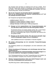 3 Der Transport nahm die Route von Zollchow 8 km L97 bis zur B188 - 76 km B188 über Tangermünde, Stendal und Gardelegen (keine Ortsdurchfahrten au- ßer Dörfer) - 2 km L26 bis Peckfitz (gemäß Angabe des Tierhalters). Die Trans- portzeit betrug etwa 1 Stunde und 30 Minuten. 5. Wie war der Transporter des Herstellers Berdex ausgestattet? 2 Bitte auf das Fahrzeugmodell, die einzelnen Ladeoberflächen je m und die zulässige Höchstlast eingehen. Der Transporter war folgendermaßen ausgestattet: - Ladefläche gesamt: 100,32 m² - Ladefläche pro Etage (insgesamt 3 Etagen): 33,44 m² - Ladefläche pro Bucht (5 Buchten pro Etage): 6,69 m² - zulässige Höchstlast: 40.000 kg (bei 17.000 kg Leergewicht). 5.1. Bezogen auf die Ladeoberflächen des Transportfahrzeugtyps: Auf wie viele Decks verteilt, können wie viele Ferkel geladen werden? Die Schweine können auf 3 Decks geladen werden. Bis zu einem Körper- gewicht von 6 kg können 475 Ferkel pro Boden geladen werden. Bei einem Körpergewicht über 6 kg bis 10 kg können 300 Ferkel pro Bo- den geladen werden. 5.2. Bezogen auf die einzelnen Decks: Wie viele durch Quergitter abge- trennte Ferkelgruppen ergaben sich pro Verladedeck? Jede Ladefläche wird durch 4 Querwände in 5 Buchten eingeteilt. 6. Mit welcher Lüftungsanlage war der verwendete Transportfahrzeugtyp ausgestattet? Die Ausstattung bestand aus Lüftungsklappen und einem elektrischen Lüfter pro Bucht. 7. Welche Ausstattung mit Tränkwasser und -einrichtungen wies das Trans- portfahrzeug auf? Bitte auf die Kapazität der Tränkwasserbehälter (Fassungsvermögen in Li- ter) und die Anzahl der Tränknippel je Verladedeck eingehen. Eine Tränkwassereinrichtung ist auf dem Transportfahrzeug nicht installiert, da damit ausschließlich Transporte unter 8 Stunden durchgeführt werden. 8. Welches Transportunternehmen führte den Ferkel-Transport durch und wo ist der Firmenhauptsitz des Unternehmens? PELAPRO Pigs GmbH in 39649 Gardelegen, OT Peckfitz.
