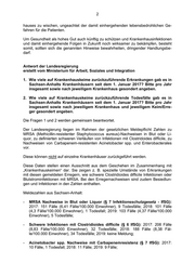 2 hauses zu wischen, ungeachtet der damit einhergehenden lebensbedrohlichen Ge- fahren für die Patienten. Um Gesundheit als hohes Gut auch künftig zu schützen und Krankenhausinfektionen und damit einhergehende Folgen in Zukunft noch wirksamer zu bekämpfen, besteht somit, sollten sich die genannten Hinweise bewahrheiten, dringender Handlungsbe- darf. Antwort der Landesregierung erstellt vom Ministerium für Arbeit, Soziales und Integration 1. Wie viele auf Krankenhauskeime zurückzuführende Erkrankungen gab es in Sachsen-Anhalts Krankenhäusern seit dem 1. Januar 2017? Bitte pro Jahr insgesamt sowie nach jeweiligem Krankenhaus gesondert angeben. 2. Wie viele auf Krankenhauskeime zurückzuführende Todesfälle gab es in Sachsen-Anhalts Krankenhäusern seit dem 1. Januar 2017? Bitte pro Jahr insgesamt sowie nach jeweiligem Krankenhaus und jeweiligem Keim/Erre- ger gesondert angeben. Die Fragen 1 und 2 werden gemeinsam beantwortet. Der Landesregierung liegen im Rahmen der gesetzlichen Meldepflicht Zahlen zu MRSA (Methicillin-resistenter Staphylococcus aureus)-Nachweisen in Blut oder Li- quor, zu definierten schweren Verläufen von Infektionen mit Clostridoides difficile, zu Nachweisen von Carbapenem-resistenten Acinetobacter spp. und Enterobacterales vor. Diese können nicht auf einzelne Krankenhäuser zurückgeführt werden. Diese Daten stellen einen Ausschnitt aus dem Geschehen im Zusammenhang mit „Krankenhauskeimen“ dar. Sie zeigen z. B. spezielle Umstände von Erkrankungen mit diesen gemeldeten Erregern, wie schwere Clostridioides difficile Infektionen oder Blutstrominfektionen mit MRSA. Bei den Erregernachweisen sind zudem Besiedlun- gen und Infektionen in den Zahlen enthalten. Meldezahlen aus Sachsen-Anhalt: ‐ MRSA Nachweise in Blut oder Liquor (§ 7 Infektionsschutzgesetz - IfSG): 2017: 151 Fälle (6,41 Fälle/100.000 Einwohner), 9 Todesfälle; 2018: 101 Fälle (4,3 Fälle/100.000 Einwohner), 1 Todesfall; 2019: 103 Fälle (4,37 Fälle/100.000 Einwohner), 5 Todesfälle; ‐ Schwere Infektionen mit Clostridioides difficile (§ 6 IfSG): 2017: 208 Fälle (8,83 Fälle/100.000 Einwohner), 32 Todesfälle; 2018: 188 Fälle (8,38 Fäl- le/100.000 Einwohner), 34 Todesfälle; 2019: keine Meldung; ‐ Acinetobacter spp. Nachweise mit Carbapenemresistenz (§ 7 IfSG): 2017: 10 Fälle, 1 Todesfall; 2018: 11 Fälle; 2019: 9 Fälle;