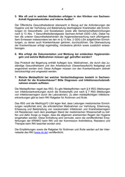4 5. Wie oft und in welchen Abständen erfolgen in den Kliniken von Sachsen- Anhalt Hygienekontrollen und interne Audits? Der Öffentliche Gesundheitsdienst überwacht in Bezug auf die Anforderungen der Hygiene und der Verhütung und Bekämpfung übertragbarer Krankheiten alle Einrich- tungen im Gesundheits- und Sozialwesen sowie alle Gemeinschaftseinrichtungen nach § 13 Abs. 1 Gesundheitsdienstgesetz Sachsen-Anhalt (GDG LSA). Dabei ha- ben die unteren Gesundheitsbehörden die Hygieneüberwachung nach pflichtgemä- ßem Ermessen insbesondere bei den im § 13 Abs. 2 GDG LSA aufgeführten Einrich- tungen, zu denen auch Krankenhäuser gehören, durchzuführen. Die Überwachung der Krankenhäuser erfolgt regelmäßig, mindestens jährlich sowie zusätzlich anlass- bezogen. 6. Wie erfolgt die Dokumentation und Meldung bei entdeckten Hygienemän- geln und welche Maßnahmen müssen ggf. getroffen werden? Das Protokoll der Begehung enthält Auflagen bzw. Maßnahmen, die durch das zu- ständige Gesundheitsamt und den Arbeitsschutz (Gewerbeaufsicht) festgelegt und angeordnet worden sind. Diese Auflagen müssen von den Krankenhäusern zeitnah berücksichtigt und umgesetzt werden. 7. Welche Meldepflicht bei welcher Verdachtsdiagnose besteht in Sachsen- Anhalt für die Krankenhäuser? Bitte Diagnosen und Infektionsschutzmaß- nahmen einzeln auflisten. Die Meldepflichten regelt das IfSG. Es gibt Meldepflichten nach § 6 IfSG (Meldungen von Infektionserkrankungen durch die Ärzteschaft) und nach § 7 IfSG (Meldungen von Infektionserregern durch die Laboratorien). Zu allen meldepflichtigen Infektions- erkrankungen gibt es beim RKI Ratgeber für Ärztinnen und Ärzte. Das IfSG und die MedHygVO LSA legen fest, dass Leitungen medizinischer Einrich- tungen verpflichtet sind, die erforderlichen Maßnahmen zur Verhütung, Erkennung, Erfassung und Bekämpfung von nosokomialen Infektionen und Krankheitserregern mit Resistenzen nach dem jeweiligen Stand der medizinischen Wissenschaft zu tref- fen und dafür Sorge zu tragen, dass die allgemein anerkannten Regeln der Hygiene eingehalten werden. Diese Einhaltung wird vermutet, wenn die veröffentlichten Emp- fehlungen der KRINKO beim RKI und der Kommission Antiinfektiva, Resistenz und Therapie beim RKI beachtet worden sind. Die Empfehlungen sowie die Ratgeber für Ärztinnen und Ärzte werden auf der Inter- netseite des RKI (www.rki.de) veröffentlicht.