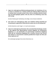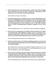 2 2. Welche Fördermittel des Landes Sachsen‐Anhalt in welcher Höhe erhielt die Magde‐ burger Familienhaus UG für das Jahr 2020 zum Betrieb des „Familienhaus im Park“? Bitte jeweils nach Art und Höhe der Förderung aufschlüsseln. Auf die Antwort zu Frage 1 wird verwiesen. 3. Entsprechend Mitteilung der Landesregierung vom 27. Februar 2020 erfolgte eine För‐ derung der sozialpädagogischen Arbeit im Familienzentrum der Familienhaus Magde‐ burg gGmbH im Jahr 2019 in Höhe von 21.488,99 Euro. Laut Zuwendungsbescheid war ein Verwendungsnachweis für diese Förderung bis zum 31. März 2020 vorzulegen. Wurde ein solcher Verwendungsnachweis fristgerecht vorgelegt? Falls nein, warum nicht? Der Verwendungsnachweis ist am 1. April 2020 im Landesverwaltungsamt eingegangen. 4. Wurde durch die Landesregierung eine inhaltliche Prüfung hinsichtlich der im Mittel‐ verwendungsnachweis 2019 aufgeführten Ausgaben nach Art und Umfang der Ver‐ wendungen vorgenommen? Falls ja, konnten bei der Prüfung Verstöße gegen die Vor‐ gaben aus dem Förderbescheid festgestellt werden und welcher Art waren diese? Die Verwendungsnachweisprüfung ist noch nicht abgeschlossen. 5. Erhielt das Familienzentrum der Familienhaus Magdeburg gGmbH auch für die Jahre 2020 und 2021 Zuwendungsbescheide und wurde der Mittelverwendungsnachweis für das Jahr 2020 vorgelegt? Das Familienzentrum wurde über die Familienhaus Magdeburg gGmbH auch im Jahr 2020 und wird auch im Jahr 2021 gefördert. Der Verwendungsnachweis für das Jahr 2020 ist fristgemäß am 31. März 2021 eingegangen. 6. Wurde durch die Landesregierung eine inhaltliche Prüfung hinsichtlich der im Mittel‐ verwendungsnachweis 2020 aufgeführten Ausgaben nach Art und Umfang der Ver‐ wendungen vorgenommen? Falls ja, konnten bei der Prüfung Verstöße gegen die Vor‐ gaben aus dem Förderbescheid festgestellt werden und welcher Art waren diese? Da der Verwendungsnachweis für 2020 noch nicht vorliegt, sind keine Angaben möglich.