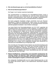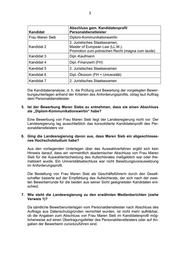 2 2. Wie viele Bewerbungen gab es auf die Geschäftsführer-Position? 3. Wie lief das Bewerbungsverfahren? Die Fragen 2 und 3 werden zusammen beantwortet. Das Auswahlverfahren zur Besetzung der Geschäftsführer-Position wurde in 2011/2012 durch eine vom Aufsichtsrat der Lotto-Toto GmbH Sachsen-Anhalt gebildete Auswahlkommission unter Vorsitz des damaligen Aufsichtsratsvorsit- zenden und mit Unterstützung eines Personaldienstleisters durchgeführt. Die Suche geeigneter Kandidaten erfolgte vornehmlich durch den Personal- dienstleister im Wege der Direktansprache. Dabei wurden vom Personaldienst- leister von Mitgliedern des Aufsichtsrates bzw. der Auswahlkommission benannte potentiell geeignete Kandidaten in das Verfahren einbezogen. Laut einem Bericht des Personaldienstleisters vom 28.11.2011 gegenüber der Auswahlkommission des Aufsichtsrats wurden insgesamt 170 potentielle Kandi- daten im Wege der Direktansprache durch den Personaldienstleister kontaktiert. Von den Angesprochenen zeigten sich 64 Personen grundsätzlich interessiert. Nach der Durchführung von strukturierten Telefoninterviews und persönlichen Gesprächen des Personaldienstleisters mit interessierten und geeigneten Kandi- daten wurden nach den vorliegenden Unterlagen des Auswahlverfahrens in zwei Terminen (30.11.2011 und 04.06.2012) insgesamt zehn Kandidaten der Aus- wahlkommission des Aufsichtsrats vorgestellt. Ein Kandidat war als Finalist der ersten Bewerberrunde auch in der zweiten Bewerberrunde vertreten. Eine zweite Bewerberrunde im Juni 2012 war erforderlich, da im Rahmen der Vertragsver- handlungen der im ersten Termin ausgewählte Kandidat seine Bereitschaft zur Übernahme der Geschäftsführung zurückgezogen hatte. Dem Vorschlag der Findungskommission folgend und unter Berücksichtigung der kurzfristig eingetretenen Vakanz der Position des Prokuristen empfahl der Auf- sichtsrat nach eingehender Diskussion mit Beschluss vom 13.06.2012 der Ge- sellschafterversammlung zwei Geschäftsführer, darunter Frau Maren Sieb, zu be- rufen. Die notarielle Bestellung der neuen Geschäftsführung durch den Gesell- schafter fand am 19.07.2012 statt. 4. Welche Qualifikationen, insbesondere auch hinsichtlich akademischer Ab- schlüsse, besaßen die Bewerber? Bitte vergleichend aufgeschlüsselt zwi- schen Maren Sieb und nicht-namentlich den anderen Bewerbern. Inwiefern werden diesbezügliche Angaben auf Bewerbungen geprüft? Die vorliegenden Kandidatenprofile aus der zweiten Bewerbungsrunde, an der Frau Maren Sieb teilnahm, geben zu den akademischen Abschlüssen folgende Auskünfte: