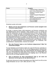 2 für das Mitteldeutsche Revier Lösungen in allen Bereichen des wirtschaftlichen und gesellschaftlichen Lebens, um dem strukturellen Wandel proaktiv zu begegnen, die Zukunft des Mitteldeutschen Reviers zu gestalten und die Regionen vor diesem Hin- tergrund in zukunftsfähige Standorte zu wandeln. Für ein Gelingen des Strukturwandels ist es daher von großer Bedeutung, dass Land, Kommunen, Wirtschaft und Wissenschaft sowie die Zivilgesellschaft im Mittel- deutschen Revier im Dialog zusammenarbeiten, um bestehende und künftige Poten- tiale zu identifizieren, zu nutzen und auszubauen. So können gemeinsam neue Per- spektiven für die Region entwickelt werden. Die Strategiekonferenz am 21. Juni 2019 ist eine Folgeveranstaltung, die analog zur ersten Konferenz in Böhlen (Freistaat Sachsen) konzipiert und umgesetzt wurde. Sie ist als Auftakt für eine Reihe ver- schiedener Aktivitäten in Sachsen-Anhalt zu verstehen, um im Dialog mit den oben genannten relevanten Akteuren den Strukturwandel auf den Weg zu bringen. Für diese Auftaktveranstaltung in Sachsen-Anhalt mit regionalen Akteuren konnten hoch- rangige Vertreter des Bundes, des Freistaates Sachsen und der Europäischen Kommission gewonnen werden. Dies vorausgeschickt, beantwortet die Landesregierung die Einzelfragen wie folgt: 1. Wie hoch waren die Gesamtkosten für die Veranstaltung (Landesmittel und weitere Mittel)? Mitteleinsatz InfraLeuna GmbH 11.000,00 € (kalkulatorische Kosten) Mitteleinsatz Mitteldeutsche Braunkohlen- 13.604,56 € gesellschaft mbH Landesmittel 14.676,10 € 2. Wie setzen sich Ausgaben und Einnahmen der Konferenz zusammen? Bit- te einzelne Positionen aufschlüsseln. Partner Ausgaben InfraLeuna GmbH 11.000,00 € (kalkulatorische Kosten) - Nutzung des Kulturhauses - Nutzung der Tagungstechnik - Technisches Personal - Durchführung der Veranstaltung Mitteldeutsche Braunkohlengesellschaft 13.604,56 € mbH - Tagungscatering, inkl. MWSt. Landesmittel 14.676,10 € darunter - 1.791,65 € Werbemittel (Layout, Produktion von Veranstaltungsprä- sentation, Fahnen, Banner) - 458,50 € Rollups - 5.819,50 € Einladung (Layout, Druck, Versand, Porto) sowie Corpo- rate Design der Veranstaltung, Ko- pien, Klemmschienen für Handouts