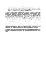 5 11. Neben Redebeiträgen von Ministerpräsident Haseloff und Kanzleramtsmi- nister Braun sowie EU-Kommissar Oettinger traten auch die Geschäfts- führer der InfraLeuna GmbH und der Mitteldeutschen Braunkohlegesell- schaft mbH auf. Wie kam es zu der Entscheidung, eben diesen Personen auf der Veranstaltung einen Redebeitrag zu gewähren? Im Einklang mit dem Titel der Veranstaltung „Perspektiven erkennen und gemeinsam gestalten“ war es inhaltlicher Anspruch der Organisatoren, Redebeiträge von Vertre- tern der Politik, Wirtschaft und Wissenschaft zu ermöglichen. Aus diesem Grund gab es nach der umfangreichen Diskussion mit allen Anwesenden die Möglichkeit für die Schwerpunktbereiche des Strukturwandels, ihre Perspektive einzubringen umso dem Ziel der Veranstaltung - einem breiten und öffentlichen Austausch aller Sichtweisen zu beginnen - gerecht zu werden. So sprach der Landrat des Burgenlandkreises und gleichzeitig Vorsitzender des Aufsichtsrates der Europäischen Metropolregion Mittel- deutschland für die regionale und kommunale Ebene, gefolgt von dem Geschäftsfüh- rer der MIBRAG für den Energiesektor, der Geschäftsführer von InfraLeuna und gleichzeitig Vorstandsmitglied des Landesverbandes des Verbandes Chemischer In- dustrie Sachsen-Anhalt für die Chemiebranche, der Vorstandvorsitzende des BioEconomy e. V. für den Sektor der Biotechnologie und den industriellen Biohub Mitteldeutschland sowie der Leiter des Frauenhofer-Instituts für Mikrostruktur von Werkstoffen und Systemen (IMWS) für den Bereich Innovation und Forschung. Im weiteren Verlauf der Veranstaltungsreihe sind für Vertreter verschiedener struktur- relevanter Unternehmen und Verbände der Wirtschaft Redemöglichkeiten vorge- sehen.