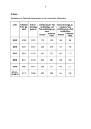 3 Anlage 1 Straftaten und Tatverdächtige gesamt in der Lutherstadt Wittenberg Jahr Erfasste Tatver- nichtdeutsche Tat- tatverdächtige Zu- Fälle ge- dächtige verdächtige von wanderer von samt gesamt Tatverdächtige ge- nichtdeutsche Tat- samt verdächtige erfasste erfasste Anzahl Anzahl Fälle Fälle 2015 5.380 1.991 175 185 98 99 2016 5.401 1.991 256 275 147 156 2017 4.974 1.742 253 272 162 172 2018 4.741 1.745 248 281 152 196 2019 4.563 1.674 258 317 145 237 01.01.- 4.119 1.586 322 383 144 189 30.09.20
