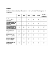 4 Anlage 2 Straftaten mit tatverdächtigen Zuwanderern in der Lutherstadt Wittenberg nach De- liktsgruppen 01.01.- 2015 2016 2017 2018 2019 30.09.2020 Straftaten gegen 0 1 0 0 0 0 das Leben Straftaten gegen die sexuelle Selbstbe- 3 4 2 9 3 6 stimmung Rohheitsdelikte und Straftaten gegen die 13 21 43 54 53 27 persönliche Freiheit Diebstahl insge- 25 40 29 21 36 35 samt Vermögens- und 37 57 66 65 41 56 Fälschungsdelikte Sonstige Straftat- 9 16 27 26 66 34 bestände StGB Strafrechtliche Ne- 12 17 5 21 38 31 bengesetze