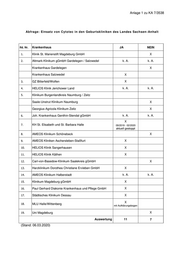 Anlage 1 zu KA 7/3538 Abfrage: Einsatz von Cytotec in den Geburtskliniken des Landes Sachsen -Anhalt lfd. Nr. Krankenhaus JA NEIN 1. Klinik St. Marienstift Magdeburg GmbH X 2. Altmark-Klinikum gGmbH Gardelegen / Salzwedel k. A. k. A. Krankenhaus Gardelegen X Krankenhaus Salzwedel X 3. GZ Bitterfeld/Wolfen X 4. HELIOS Klinik Jerichower Land k. A. k. A. 5. Klinikum Burgenlandkreis Naumburg / Zeitz Saale-Unstrut Klinikum Naumburg X Georgius-Agricola Klinikum Zeitz X 6. Joh. Krankenhaus Genthin-Stendal gGmbH k. A. k. A. X 7. KH St. Elisabeth und St. Barbara Halle 09/2019 - 02/2020 aktuell gestoppt 8. AMEOS Klinikum Schönebeck X 9. AMEOS Kliniken Aschersleben-Staßfurt X 10. HELIOS Klinik Sangerhausen X 11. HELIOS Klinik Käthen X 12. Carl-von-Basedow-Klinikum Saalekreis gGmbH X 13. Harzklinikum Dorothea Christiane Erxleben GmbH X 14. AMEOS Klinikum Halberstadt k. A. k. A. 15. Klinikum Magdeburg gGmbH X 16. Paul Gerhard Diakonie Krankenhaus und Pflege GmbH X 17. Städtisches Klinikum Dessau X X 18. MLU Halle/Wittenberg mit Aufklärungsbogen 19. Uni Magdeburg X Auswertung 11 7 (Stand: 06.03.2020)