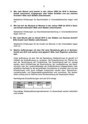 2 3. Wie viele Bäume sind jeweils in den Jahren 2008 bis 2018 in Sachsen- Anhalt vertrocknet, eingegangen oder hatten Schäden und aus welchen Gründen? Bitte nach Städten aufschlüsseln. Statistische Erhebungen für Baumschäden in Innenstadtbereichen liegen nicht vor. 4. Wie hat sich der Bestand an Bäumen in den Jahren 2008 bis 2018 in Sach- sen-Anhalt entwickelt? Bitte nach Städten aufschlüsseln. Statistische Erhebungen zur Baumbestandsentwicklung in Innenstadtbereichen liegen nicht vor. 5. Wie viele Bäume gibt es aktuell 2019 in den Städten von Sachsen-Anhalt? Bitte Anzahl nach Städten aufschlüsseln. Statistische Erhebungen für die Anzahl von Bäumen in den Innenstädten liegen nicht vor. 6. Welche Aufforstungen mit dem Ziel einer Bewaldung gibt es in Sachsen- Anhalt seit 2016 und welche sind geplant? Bitte nach Regionen aufschlüs- seln. Unter Aufforstung mit dem Ziel der Bewaldung (Waldmehrung) ist gemäß § 9 LWaldG die Erstaufforstung zu verstehen. Die Erstaufforstung von Flächen be- darf der Genehmigung der Forstbehörde. Die Genehmigung darf nur versagt werden, wenn Erfordernisse der Raumordnung, der Landesplanung, des Natur- schutzes oder der Landschaftspflege der Erstaufforstung entgegenstehen oder erhebliche Nachteile für die benachbarten Grundstücke zu erwarten sind und den Erfordernissen nicht durch Auflagen entsprochen werden kann. Naturschutz-, Landwirtschafts- und Regionalplanungsbehörden sind anzuhören. Der landes- weite Umfang wird im Rahmen einer Bundesmeldung als Gesamtzahl erfasst. Nachfolgende Erstaufforstungen sind seit 2016 erfolgt: Jahr 2016 2017 2018 Fläche 97,55 82,42 90,5 [ha] Planmäßige Wiederaufforstungsmaßnahmen im Gesamtwald werden behördlich nicht erfasst.