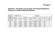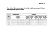 Anlage 1 Übersicht – Einnahmen aus der land- und forstwirtschaftlichen Nutzung im Burgenlandkreis Oberflächenwasser Grundwasser Einnahmen Einnahmen EHJ tats. Was- tats. Was- Einnahmen tats. Was- Einnahmen tats. Was- Beregnung, Beregnung, sermengen sermengen Kühlung sermengen Fischzucht sermengen Berieselung Berieselung in m³/a in m³/a in € in m³/a in € in m³/a in € in € 2012 356,84 71.368 1.619,70 80.985 0 0 0 0 2013 17,28 3.456 2.044,06 102.203 0 0 0 0 2014 17,28 3.456 1.361,68 68.084 0 0 0 0 2015 36,50 7.300 2.058,98 102.949 0 0 0 0 2016 80,28 16.055 1.592,60 79.630 0 0 0 0 2017 7,45 1.490 584,64 29.232 0 0 0 0