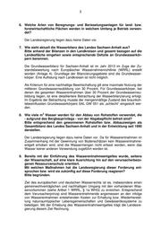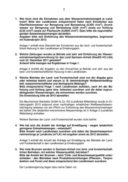 3 6. Welche Arten von Beregnungs- und Berieselungsanlagen für land- bzw. forstwirtschaftliche Flächen werden in welchem Umfang je Betrieb verwen- det? Der Landesregierung liegen dazu keine Daten vor. 7. Wie sieht aktuell die Wasserbilanz des Landes Sachsen-Anhalt aus? Bitte anhand der Bilanzen in den Landkreisen und gesamt bezogen auf die Landesfläche eingehen sowie entsprechende Defizite an Grundwasserkör- pern benennen. Die Grundwasserbilanz für Sachsen-Anhalt ist im Jahr 2013 im Zuge der Zu- standsbewertung nach Europäischer Wasserrahmenrichtlinie (WRRL) erstellt worden (Anlage 4). Grundlage der Bilanzierungsgebiete sind die Grundwasser- körper. Eine Auflistung nach Landkreisen ist nicht möglich. Als Kriterium für eine nachhaltige Bewirtschaftung gilt eine maximale Nutzung der mittleren Grundwasserneubildung von 30 Prozent. Für Grundwasserkörper, bei denen die gesamten Wasserentnahmen über 30 Prozent der Grundwasserneu- bildung liegen, ist eine detailliertere Betrachtung der Wasserbilanzierung erfolgt. Im Ergebnis der Betrachtung musste der mengenmäßige Zustand des braunkoh- lebeeinflussten Grundwasserkörpers SAL GW 051 als „schlecht“ eingestuft wer- den. 3 8. Wie viele m Wasser werden für den Abbau von Rohstoffen verwendet, die - aufgrund des Bergbauprivilegs - von der Abgabepflicht befreit sind? Bitte entsprechend den gewonnenen Rohstoffen bzw. Abbauzweigen als Gesamtbilanz des Landes Sachsen-Anhalt und in der Entwicklung seit 1990 darstellen. Der Landesregierung liegen dazu keine Daten vor. Da für Wasserentnahmen im Zusammenhang mit der Gewinnung von Bodenschätzen kein Wasserentnahme- entgelt erhoben wird, sind die Wassermengen nicht erfasst worden, wenn das Wasser keiner anderen Verwendung zugeführt worden ist. 9. Bereits mit der Einführung des Wasserentnahmeentgeltes wurde, seitens der Wissenschaft, auf eine klare Ausrichtung hin auf den verursacherbezo- genen Ressourcenschutz orientiert. Mit welchen Maßnahmen hat die Landesregierung dieser Forderung ent- sprochen bzw. wird sie zukünftig auf diese Forderung reagieren? Bitte begründen. Ziel des europäischen und deutschen Wasserrechts ist es, insbesondere einen gemeinwohlverträglichen und nachhaltigen Umgang mit den vorhandenen Was- servorkommen (siehe Artikel 1 WRRL, § 1a WHG) zu erreichen. Entsprechend dem Verursacherprinzip sind Wasserentnehmende angemessen an den infolge von Wasserentnahmen entstehenden Kosten zur Erhaltung bzw. Wiederherstel- lung naturraumtypischer Lebensgemeinschaften und Gewässerökosysteme zu beteiligen. Mit der Erhebung des Wasserentnahmeentgeltes trägt die Landesre- gierung diesem Ziel Rechnung.