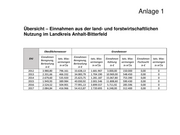 Anlage 1 Übersicht – Einnahmen aus der land- und forstwirtschaftlichen Nutzung im Landkreis Anhalt-Bitterfeld Oberflächenwasser Grundwasser Einnahmen Einnahmen EHJ tats. Was- tats. Was- Einnahmen tats. Was- Einnahmen tats. Was- Beregnung, Beregnung, sermengen sermengen Kühlung sermengen Fischzucht sermengen Berieselung Berieselung in m³/a in m³/a in € in m³/a in € in m³/a in € in € 2012 3.980,80 796.161 33.638,13 1.681.907 3.000,00 150.000 0,00 0 2013 2.331,66 466.332 34.083,79 1.704.190 10.969,00 548.450 0,00 0 2014 2.679,60 535.920 25.623,75 1.281.187 15.067,80 753.390 0,00 0 2015 1.949,93 389.984 40.030,92 2.001.546 11.808,60 590.430 0,00 0 2016 2.524,52 504.901 77.991,13 3.899.557 5.711,92 285.596 0,00 0 2017 2.084,84 416.966 54.413,87 2.720.693 6.248,00 312.400 0,00 0
