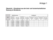 Anlage 1 Übersicht – Einnahmen aus der land- und forstwirtschaftlichen Nutzung im Bördekreis Oberflächenwasser Grundwasser Einnahmen Einnahmen EHJ tats. Was- tats. Was- Einnahmen tats. Was- Einnahmen tats. Was- Beregnung, Beregnung, sermengen sermengen Kühlung sermengen Fischzucht sermengen Berieselung Berieselung in m³/a in m³/a in € in m³/a in € in m³/a in € in € 2012 6.217,59 1.243.517 16.648,90 832.445 - - - - 2013 6.149,90 1.229.980 25.536,92 1.276.846 - - - - 2014 6.595,00 1.319.000 26.321,02 1.316.051 - - - - 2015 5.778,54 1.155.707 27.431,60 1.371.580 - - - - 2016 6.259,08 1.251.815 36.354,16 1.817.708 - - - - 2017 4.151,24 830.248 7.642,18 382.109 - - - -