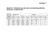 Anlage 1 Übersicht – Einnahmen aus der land- und forstwirtschaftlichen Nutzung im Landkreis Harz Oberflächenwasser Grundwasser Einnahmen Einnahmen EHJ tats. Was- tats. Was- Einnahmen tats. Was- Einnahmen tats. Was- Beregnung, Beregnung, sermengen sermengen Kühlung sermengen Fischzucht sermengen Berieselung Berieselung in m³/a in m³/a in € in m³/a in € in m³/a in € in € 2012 974,35 194.869 1.388,01 69.401 37,32 1.866 0 0 2013 2.206,29 441.259 1.485,41 74.270 29,20 1.460 0 0 2014 803,27 160.655 944,65 47.232 0 0 0 0 2015 597,25 119.450 3.539,57 176.979 8,92 446 0 0 2016 179,15 35.830 3.755,68 187.784 1,60 80 0 0 2017 30,00 6.000 1.720,32 86.016 0 0 0 0