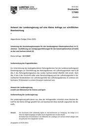 05.05.2021 Drucksache 7/7683 öffentlich Antwort der Landesregierung auf eine Kleine Anfrage zur schriftlichen Beantwortung – Abgeordneter Rüdiger Erben (SPD) Umsetzung des Ausstattungskonzeptes für den bundeseigenen Katastrophenschutz im Zi‐ vilschutz ‐ Auslieferung von Löschgruppenfahrzeugen für den Katastrophenschutz (LF‐KatS) an das Land Sachsen‐Anhalt (X) Kleine Anfrage ‐ KA 7/4507 Vorbemerkung des Fragestellenden: Zur Unterstützung des bodengebundenen Rettungsdienstes hat des Landesverwaltungsamt Genehmigungen zur Durchführung des Rettungsdienstes mit Luftrettungsmitteln nach § 28 Abs. 1 des Rettungsdienstgesetzes des Landes Sachsen‐Anhalt (RettDG LSA) erteilt. Nach Abs. 4 Satz 3 der Vorschrift sollte unter Berücksichtigung auch der Luftrettungsmittel in be‐ nachbarten Bundesländern ein Luftrettungsmittel des Luftrettungsdienstes im Umkreis von höchstens 70 Kilometern zu einem Einsatzort stationiert sein. Antwort der Landesregierung erstellt vom Ministerium für Inneres und Sport Vorbemerkung der Landesregierung: Die Landesregierung geht davon aus, dass der Anfragesteller irrtümlich einen falschen Be‐ treff für die Kleine Anfrage gewählt hat und beantwortet diese deshalb ungeachtet des Be‐ treffs. Hinweis: Die Drucksache steht vollständig digital im Internet/Intranet zur Verfügung. Die Anlage ist in Word als Objekt beigefügt und öffnet durch Doppelklick den Acrobat Reader. Bei Bedarf kann Einsichtnahme in der Bibliothek des Landtages von Sachsen‐Anhalt erfolgen oder die gedruckte Form abgefordert werden. (Ausgegeben am 06.05.2021)