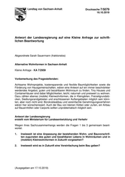 Landtag von Sachsen-Anhalt Drucksache 7/5079 16.10.2019 Antwort der Landesregierung auf eine Kleine Anfrage zur schrift- lichen Beantwortung Abgeordnete Sarah Sauermann (fraktionslos) Alternative Wohnformen in Sachsen-Anhalt Kleine Anfrage - KA 7/2959 Vorbemerkung des Fragestellenden: Achtsame Wohnprojekte, kostensparende und flexible Baumöglichkeiten sowie die Förderung von Hausgemeinschaften, wären eine Antwort auf ein immer beschränkter werdendes Angebot, guten und bezahlbaren Wohnraum zu finden. Tiny Houses und Containerhäuser sind dabei Möglichkeiten, leicht, naturnah und preiswert zu wohnen. Dazu zählen ebenso (mobile) Kleinwohnformen, die in Kleingärten, Freizeitgrundstü- cken, Siedlungsrandgebieten und erschlossenen Außengebieten möglich sein könn- ten, aber noch nicht sind. Bürokratieabbau und vereinfachte Genehmigungsverfahren wären hier wünschenswert. Auch der Bau von kleinen Hütten oder Jurten, ein Anbau auf Bauernhöfen oder Carports sollten unproblematisch möglich sein. Antwort der Landesregierung erstellt vom Ministerium für Landesentwicklung und Verkehr Wegen ihres Sachzusammenhangs werden die Fragen 1 bis 3 gemeinsam beant- wortet. 1. Inwieweit ist eine Anpassung der bestehenden Wohn- und Bauvorschrif- ten zugunsten des guten und bezahlbaren Lebens in Wohnräumen und in (mobilen) Kleinwohnformen in Zukunft vorgesehen? 2. Inwieweit wird es in Zukunft eine Vereinfachung beim Bau geben? (Ausgegeben am 17.10.2019)