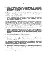 2 2. Welche Maßnahmen plant die Landesregierung zur vollständigen Umsetzung der Richtlinie zum europäischen Kodex für elektronische Kommunikation, um tatsächlich alle Bürgerinnen und Bürger über ihre Mobiltelefone zu erreichen? Die Bürgerinnen und Bürger sind bereits über ihre Mobiltelefone erreichbar, wenn sie z. B. die Warn-App NINA installiert haben. Nach Auffassung des Bundes sind damit die Anforderungen der Richtlinie erfüllt. 3. Gibt es in Sachsen-Anhalt Bestrebungen, auch den Dienst Cell-Broadcast für Warnnachrichten zukünftig zu nutzen? Wenn ja, wie wird dieser bis wann technisch umgesetzt sein? Nein. Es handelt sich bei Cell-Broadcast zwar um einen Bestandteil der internatio- nalen Mobilfunk-Standards, die hierfür nötige Technik ist aber in den deutschen Mobilfunknetzen nicht vorhanden. Das Land hat auch nicht die rechtliche Möglichkeit, die Betreiber von Mobilfunknetzen zum Einsatz einer bestimmten Technik in ihren Netzen zu verpflichten. Die Gesetzgebung im Bereich der Telekommunikation obliegt nach Art. 73 Abs. 1 Nr. 7 des Grundgesetzes ausschließlich dem Bund. 4. Bis wann wird das Land Sachsen-Anhalt die Richtlinie zum europäischen Kodex für elektronische Kommunikation in vollem Umfang und technisch einwandfrei umgesetzt haben, um die Bevölkerungswarnung zu gewähr- leisten? Auf die Antworten auf die Fragen 1 und 2 wird verwiesen. 5. Wie schätzt die Landesregierung den Grad der Alarmierungsfähigkeit in Sachsen-Anhalt zum gegenwärtigen Zeitpunkt mit den vorhandenen technischen Möglichkeiten ein? Alle Landkreise und kreisfreien Städte verfügen über eigene bzw. gemeinsame Einsatzleitstellen, zu deren Aufgaben auch die Alarmierung gehört. Damit ist die Alarmierungsfähigkeit landesweit bereits gegeben. 6. Welcher Grad der Alarmierungsfähigkeit soll nach vollständiger Umsetzung der Richtlinie zum europäischen Kodex für elektronische Kommunikation in Sachsen-Anhalt erreicht werden? Auf die Antwort auf Frage 5 wird verwiesen.