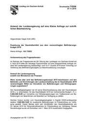 Landtag von Sachsen-Anhalt Drucksache 7/5208 07.11.2019 Antwort der Landesregierung auf eine Kleine Anfrage zur schrift- lichen Beantwortung Abgeordneter Hagen Kohl (AfD) Zuweisung der Haushaltsmittel aus dem veranschlagten Beförderungs- budget 2019 Kleine Anfrage - KA 7/2922 Vorbemerkung des Fragestellenden: Im Rahmen der Fragestunde der 69. Sitzung des Landtages von Sachsen-Anhalt am 4. April 2019 teilte der damalige Finanzminister auf eine entsprechende Anfrage mit, dass die Landesregierung beabsichtigt, noch im II. Quartal 2019 einen Vorschlag zur Verteilung des Beförderungsbudgets zur Beschlussfassung vorzulegen. Antwort der Landesregierung erstellt vom Ministerium der Finanzen Wann wurde oder wird das Beförderungskonzept 2019 beschlossen und den Behörden und Einrichtungen der Landesverwaltung die im Haushaltsplan 2019 veranschlagten Mittel zur Vornahme von Beförderungen und Höhergruppie- rungen zugewiesen? Der Haushaltsgesetzgeber hat mit seiner Beschlussfassung über den Haushaltsplan 2019 u. a. entschieden, für das Haushaltsjahr 2019 ein rechnerisches Budget i. H. v. 5.000.000 EUR zur Vornahme von Höhergruppierungen von Tarifpersonal und Be- förderungen von Beamtinnen und Beamten zur Verfügung zu stellen. Darüber hinaus wurden vom Haushaltsgesetzgeber in Kapitel 0320/Landespolizei weitere 1.000.000 EUR für zusätzliche Beförderungen im Polizeivollzug zur Verfü- gung gestellt. Dieser Betrag steht seit Inkrafttreten des Haushaltsgesetzes am 23. Januar 2019 für Personalmaßnahmen im Polizeivollzug zur Verfügung. Dieses Sonderbudget wurde mit Schreiben vom 1. März 2019 ausdrücklich freigegeben. (Ausgegeben am 08.11.2019)
