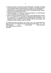 6 Erhebung, Analyse und Nutzung hochschulstatistischer Kennzahlen mit Bezug zum Qualitätsmanagement (beispielsweise zu Vergleichs- oder Regelstudienzeit- Abschlussquoten und zu Anteilen Langzeitstudierender nach Abschlussarten); Verbesserung der Studienbedingungen und der Lehrqualität einzelner Studien- gänge durch Überarbeitung der Curricula; Tutorienprogramme (z. B. Online Lern- und Übungsaufgaben zum selbstständigen Lernen und Festigen von vermitteltem Wissen); Studium Generale (Studierende können sich auf den Studienabschluss vorberei- ten, u. a. in Kursen wie z. B. „Der Weg zur erfolgreichen Abschlussarbeit - Von A wie Anfangen bis Z wie zielgerichtet Forschungsergebnisse präsentieren“ oder „Academic Writing in English for foreign students“ sowie für den Einstieg in das Arbeitsleben „Mit den richtigen Fragen zum Erfolg“). Die Maßnahmen aller Hochschulen des Landes sind in den Rektoratsberichten (https://mw.sachsen-anhalt.de/themen/hochschulen/zielvereinbarungen/) und den GWK-Berichten zum Hochschulpakt (https://www.gwk- bonn.de/dokumente/archiv/#c175) dargestellt.