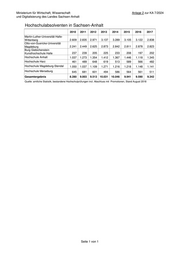 Ministerium für Wirtschaft, Wissenschaft Anlage 2 zur KA 7/2024 und Digitalisierung des Landes Sachsen-Anhalt Hochschulabsolventen in Sachsen-Anhalt 2010 2011 2012 2013 2014 2015 2016 2017 Martin-Luther-Universität Halle- Wittenberg 2.609 2.835 2.971 3.137 3.289 3.105 3.122 2.838 Otto-von-Guericke-Universität Magdeburg 2.241 2.449 2.625 2.873 2.842 2.811 2.878 2.823 Burg Giebichenstein Kunsthochschule Halle 237 239 205 225 233 208 197 202 Hochschule Anhalt 1.037 1.273 1.354 1.412 1.367 1.446 1.118 1.345 Hochschule Harz 461 489 648 619 513 589 566 482 Hochschule Magdeburg-Stendal 1.050 1.037 1.109 1.271 1.216 1.218 1.148 1.141 Hochschule Merseburg 645 681 601 494 586 564 561 511 Gesamtergebnis 8.280 9.003 9.513 10.031 10.046 9.941 9.590 9.342 Quelle: amtliche Statistik, bestandene Hochschulprüfungen incl. Abschluss mit Promotionen, Stand August 2018 Seite 1 von 1