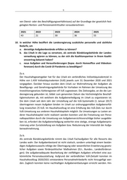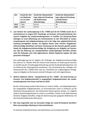6 sichtlich der Berücksichtigung zusätzlicher personeller und sächlicher Bedarfe des LVwA gilt es, die Beratungen zum Doppelhaushalt 2022/2023 abzuwarten. Zu c. Mit dem Nachtragshaushalt 2020 hat der Haushaltsgesetzgeber für das Jahr 2020 zu‐ sätzliche finanzielle Mittel zur Leistung der Ausgaben, die zur Bekämpfung der Corona‐ Pandemie und zur Bewältigung von deren Folgen erforderlich sind, ausgebracht. Zu‐ gleich wurden bis zu 100 VzÄ zur Wahrnehmung von Aufgaben zur Bewältigung der Corona‐Pandemie anerkannt. Davon wurden 43 VzÄ dem LVwA zugewiesen. Ergänzend wird auf die Antwort auf Frage 1 c verwiesen. 11. Laut Antwort der Landesregierung in der Drs. 7/1844 (auf die KA 7/1027) wurde dem LVwA mit Erlass des Innenministeriums vom 15. August 2017 die Übernahme der Auf‐ gabe „Investitionspakt soziale Integration im Quartier“ übertragen. Damit könne die Bearbeitung der vom Verfall bedrohten 28 Millionen Euro Bundesmittel vorgenom‐ men werden. Die Aufgabenwahrnehmung erfolge zunächst unter Zurückstellung ande‐ rer Aufgaben. Begleitend würden notwendige organisatorische bzw. personal‐ wirtschaftliche Maßnahmen geprüft. Welche Ergebnisse ergab die Prüfung der als notwendig beschriebenen Maßnahmen und welche Aufgaben wurden mit welchen Konsequenzen zurückgestellt? Die Prüfung der Notwendigkeit organisatorischer bzw. personalwirtschaftlicher Maß‐ nahmen ergab einen zusätzlichen Personalbedarf, der durch temporäre personelle Ver‐ stärkung aus anderen Aufgabenbereichen gedeckt wurde. Durch eine strenge Priorisie‐ rung der wahrzunehmenden Aufgaben war es möglich, die Aufgabe „Investitionspakt soziale Integration im Quartier“ ohne dauerhafte Zurückstellung von Fachaufgaben wahrzunehmen.
