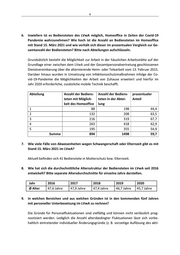 4 6. Inwiefern ist es Bediensteten des LVwA möglich, Homeoffice in Zeiten der Covid‐19 Pandemie wahrzunehmen? Wie hoch ist die Anzahl an Bediensteten im Homeoffice mit Stand 15. März 2021 und wie verhält sich dieser im prozentualen Vergleich zur Ge‐ samtanzahl der Bediensteten? Bitte nach Abteilungen aufschlüsseln. Grundsätzlich besteht die Möglichkeit zur Arbeit in der häuslichen Arbeitsstätte auf der Grundlage einer zwischen dem LVwA und der Gesamtpersonalvertretung geschlossenen Dienstvereinbarung über die alternierende Heim‐ oder Telearbeit vom 13. Februar 2015. Darüber hinaus wurden in Umsetzung von Infektionsschutzmaßnahmen infolge der Co‐ vid‐19‐Pandemie die Möglichkeiten der Arbeit von Zuhause erweitert und hierfür im Jahr 2020 erforderliche, zusätzliche mobile Technik beschafft. Abteilung Anzahl der Bediens‐ Anzahl der Bediens‐ prozentualer teten mit Möglich‐ teten in der Abtei‐ Anteil keit des Homeoffice lung 1 88 198 44,4 2 132 208 63,5 3 216 319 67,7 4 263 418 62,9 5 195 355 54,9 Summe 894 1498 59,7 7. Wie viele Fälle von Abwesenheiten wegen Schwangerschaft oder Elternzeit gibt es mit Stand 15. März 2021 im LVwA? Aktuell befinden sich 41 Bedienstete in Mutterschutz bzw. Elternzeit. 8. Wie hat sich die durchschnittliche Altersstruktur der Bediensteten im LVwA seit 2016 entwickelt? Bitte separate Altersdurchschnitte für einzelne Jahre darstellen. Jahr 2016 2017 2018 2019 2020 Ø Alter 47,6 Jahre 47,9 Jahre 47,4 Jahre 46,7 Jahre 45,7 Jahre 9. In welchen Bereichen und aus welchen Gründen ist in den kommenden fünf Jahren mit personeller Unterbesetzung im LVwA zu rechnen? Die Gründe für Personalfluktuationen sind vielfältig und können nicht verlässlich prog‐ nostiziert werden. Lediglich die Anzahl altersbedingter Fluktuationen lässt sich vorbe‐ haltlich eintretender individueller Änderungsgründe (z. B. vorzeitige Auflösung des akti‐