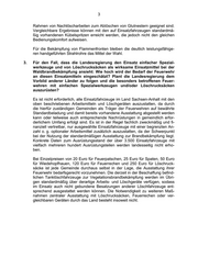 3 Rahmen von Nachlöscharbeiten zum Ablöschen von Glutnestern geeignet sind. Vergleichbare Ergebnisse können mit den auf Einsatzfahrzeugen standardmä- ßig vorhandenen Kübelspritzen erreicht werden, die jedoch nicht den gleichen Bedienungskomfort aufweisen. Für die Bekämpfung von Flammenfronten bleiben die deutlich leistungsfähige- ren handgeführten Strahlrohre das Mittel der Wahl. 3. Für den Fall, dass die Landesregierung den Einsatz einfacher Spezial- werkzeuge und von Löschrucksäcken als wirksame Einsatzmittel bei der Waldbrandbekämpfung ansieht: Wie hoch wird der Bedarf der Feuerwehr an diesen Einsatzmitteln eingeschätzt? Plant die Landesregierung dem Vorbild anderer Länder zu folgen und die besonders betroffenen Feuer- wehren mit einfachen Spezialwerkzeugen und/oder Löschrucksäcken auszurüsten? Es ist nicht erforderlich, alle Einsatzfahrzeuge im Land Sachsen-Anhalt mit den oben beschriebenen Arbeitsmitteln und Löschgeräten auszustatten, da durch die hierfür zuständigen Gemeinden als Träger der Feuerwehren auf bewährte Standardbeladung und damit bereits vorhandene Ausstattung abgestellt werden kann oder teilweise auch entsprechende Nachrüstungen in gemeindlich erfor- derlichem Umfang erfolgt sind. Es ist in der Regel fachlich zweckmäßig und fi- nanziell vertretbar, nur ausgewählte Einsatzfahrzeuge mit einer begrenzten An- zahl o. g. optionaler Arbeitsmittel zusätzlich auszustatten, da der Schwerpunkt bei der Nutzung der standardmäßigen Ausstattung zur Brandbekämpfung liegt. Konkrete Daten zum Ausrüstungsstand der über 3.500 Einsatzfahrzeuge mit vielfach mehreren hundert Ausrüstungsteilen werden landesseitig nicht erho- ben. Bei Einzelpreisen von 20 Euro für Feuerpatschen, 25 Euro für Spaten, 50 Euro für Wiedehopfhauen, 120 Euro für Feuerrechen und 250 Euro für Löschruck- säcke ist jede Gemeinde durchaus selbst in der Lage, die Ausstattung ihrer Feuerwehr bedarfsgerecht vorzunehmen. Die derzeit in der Beschaffung befind- lichen Tanklöschfahrzeuge zur Vegetationsbrandbekämpfung werden im Übri- gen standardmäßig über derartige Arbeits- und Löschgeräte verfügen, sodass im Einsatz auch nicht gebundene Besatzungen anderer Löschfahrzeuge ent- sprechend ausgestattet werden können. Die Notwendigkeit zu weiteren Maß- nahmen zentraler Ausstattung mit Löschrucksäcken, Feuerrechen oder ver- gleichbaren Geräten durch das Land besteht insoweit nicht.