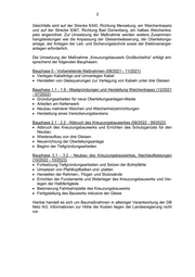 2 Gleichfalls wird auf der Strecke 6340, Richtung Merseburg, ein Weichentrapetz und auf der Strecke 6367, Richtung Bad Dürrenberg, ein halbes Weichentra- petz angeordnet. Zur Umsetzung der Maßnahme werden weitere Zusammen- hangsleistungen wie die Anpassung der Gleisentwässerung, der Oberleitungs- anlage, der Anlagen der Leit- und Sicherungstechnik sowie der Elektroenergie- anlagen erforderlich. Die Umsetzung der Maßnahme „Kreuzungsbauwerk Großkorbetha“ erfolgt ent- sprechend der folgenden Bauphasen: Bauphase 0 - Vorbereitende Maßnahmen (09/2021 - 11/2021) Verlegen Kabeltröge und Umverlegen Kabel Herstellen von Gleisquerungen zur Verlegung von Kabeln unter drei Gleisen Bauphase 1.1 - 1.9 - Mastgründungen und Herstellung Weichentrapez (12/2021 - 07/2022) Gründungsarbeiten für neue Oberleitungsanlagen-Maste Arbeiten am Kettenwerk Neubau mehrerer Weichen und Weichenheizeinrichtungen Herstellung eines Versickerungsbeckens Bauphase 2.1 - 2.2 - Abbruch des Kreuzungsbauwerkes (08/2022 - 09/2022) Abbruch des Kreuzungsbauwerks und Errichten des Schutzgerüsts für den Neubau Wiederaufbau von drei Gleisen Neuerrichtung der Oberleitungsanlage Beginn der Tiefgründungsarbeiten Bauphase 3.1 - 3.2 - Neubau des Kreuzungsbauwerkes, Nachlaufleistungen (10/2022 - 10/2023) Fortsetzung Tiefgründungsarbeiten und Setzen der Bohrpfähle Umsetzen von Pfahlkopfbalken und -platten Herstellen der Rahmen-, Flügel- und Stutzwände Errichten der Fundamente und Widerlager des Kreuzungsbauwerks und Ver- legen der Halbfertigteile Betonierung Fahrbahnplatte des Kreuzungsbauwerks Fertigstellung des Bauwerks inklusive der Gleise Hierbei handelt es sich um Baumaßnahmen in alleiniger Verantwortung der DB Netz AG. Informationen zur Höhe der Kosten liegen der Landesregierung nicht vor.