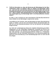 3 2. Trifft die Information zu, dass die Sanierung der Bahnsteige bei den Bau- maßnahmen außen vor bleiben? Wenn ja, bleiben die Bahnsteige außen vor, „weil sich das Land Sachsen-Anhalt, die Deutsche Bahn AG und das Eisenbahnbundesamt nicht auf die Bauhöhe der Bahnsteige einigen konn- ten“? Worin besteht diese Nichteinigung und welche Möglichkeiten sieht die Landesregierung, die Bahnsteige doch in die Baumaßnahme einzube- ziehen? Es trifft zu, dass innerhalb der oben beschriebenen DB Netz-Baumaßnahmen keine Arbeiten an den Bahnsteigen vorgenommen werden. Unzutreffend ist die Annahme, dass die Bahnsteige bei diesen Baumaßnahmen außen vor bleiben, weil sich das Land Sachsen-Anhalt, die Deutsche Bahn AG (DB AG) und das Eisenbahnbundesamt nicht auf die Bauhöhe der Bahnsteige einigen konnten. Aus Sicht der Landesregierung hängt eine mögliche Einbeziehung der Bahn- steigarbeiten von den notwendigen strategischen Vorarbeiten der DB AG zum zukünftigen Spurplan des Bahnhofs (wie viele Bahnsteige werden noch benö- tigt), dem planungs- und genehmigungsrechtlichen Vorlauf (u. a. Planfeststel- lungsverfahren) und der finanziellen Einordnung in die Unternehmenspläne der DB AG ab. Eine Einschätzung zu den Randbedingungen kann nur durch die DB AG erfolgen.