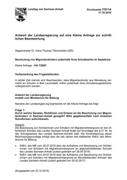 Landtag von Sachsen-Anhalt Drucksache 7/5114 17.10.2019 Antwort der Landesregierung auf eine Kleine Anfrage zur schrift- lichen Beantwortung Abgeordneter Dr. Hans-Thomas Tillschneider (AfD) Beschulung von Migrantenkindern außerhalb ihres Schulbezirks im Saalekreis Kleine Anfrage - KA 7/2887 Vorbemerkung des Fragestellenden: In letzter Zeit mehren sich Beschwerden, dass Migrantenkinder aus Merseburg ver- mehrt an Schulen in Bad Lauchstädt, mithin außerhalb ihres Schuleinzugsbereichs, untergebracht werden. Antwort der Landesregierung erstellt vom Ministerium für Bildung Namens der Landesregierung beantworte ich die Kleine Anfrage wie folgt: Frage 1: Durch welche Gesetze, Richtlinien und Erlasse ist die Beschulung von Migran- tenkindern in Sachsen-Anhalt geregelt? Bitte gegebenenfalls nach einzelnen Schulformen aufschlüsseln. Antwort: Die Beschulung von Schülerinnen und Schülern mit Migrationshintergrund an den öf- fentlichen Schulen des Landes Sachsen-Anhalt findet auf Grundlage des § 41 Nr. 4a des Schulgesetzes des Landes Sachsen-Anhalts statt. Die Konkretisierung dieser Beschulungsgrundlage erfolgt über die seit Jahren fest etablierten RdErl. des Minis- teriums für Bildung: RdErl. des MB vom 20.07.2016 über die Aufnahme und Beschulung von Schüle- rinnen und Schülern mit Migrationshintergrund an allgemeinbildenden Schulen des Landes Sachsen-Anhalt (zuletzt geändert am 28.09.2018) RdErl. des MB vom 20.07.2016 über die Aufnahme und Beschulung von Schüle- rinnen und Schülern mit Migrationshintergrund an Berufsbildenden Schulen des Landes Sachsen-Anhalt (zuletzt geändert am 29.05.2017) (Ausgegeben am 22.10.2019)