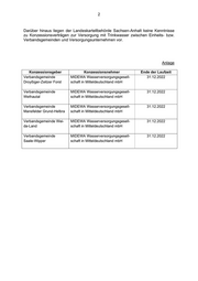 2 Darüber hinaus liegen der Landeskartellbehörde Sachsen-Anhalt keine Kenntnisse zu Konzessionsverträgen zur Versorgung mit Trinkwasser zwischen Einheits- bzw. Verbandsgemeinden und Versorgungsunternehmen vor. Anlage Konzessionsgeber Konzessionsnehmer Ende der Laufzeit Verbandsgemeinde MIDEWA Wasserversorgungsgesell- 31.12.2022 Droyßiger-Zeitzer Forst schaft in Mitteldeutschland mbH Verbandsgemeinde MIDEWA Wasserversorgungsgesell- 31.12.2022 Wethautal schaft in Mitteldeutschland mbH Verbandsgemeinde MIDEWA Wasserversorgungsgesell- 31.12.2022 Mansfelder Grund-Helbra schaft in Mitteldeutschland mbH Verbandsgemeinde Wei- MIDEWA Wasserversorgungsgesell- 31.12.2022 da-Land schaft in Mitteldeutschland mbH Verbandsgemeinde MIDEWA Wasserversorgungsgesell- 31.12.2022 Saale-Wipper schaft in Mitteldeutschland mbH