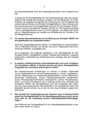 2 die Gesundheitsberufe durch die Landesregierung bisher nicht umgesetzt wer- den. In Bezug auf die Schulgeldfreiheit für die Erzieherberufe gilt, dass die Landes- regierung den Auftrag des Gesetzes umsetzen und das Ministerium für Arbeit, Soziales und Integration demgemäß eine Verordnung zu § 18f Schulgesetz des Landes Sachsen-Anhalt zur befristeten Schulgeldfreiheit in Kürze erlassen wird. Die Verordnung setzt die Schulgeldfreiheit nicht erst für das Schuljahr 2020/21, sondern schon für das laufende Schuljahr 2019/20 um. Die Finanzierung erfolgt - wie im Landtagsbeschluss vom 31.01.2019 angeregt - aus Mitteln des Geset- zes zur Weiterentwicklung der Qualität und Verbesserung der Teilhabe in der Kindertagesbetreuung. 2. Für welche Gesundheitsberufe soll mit Wirkung zum Schuljahr 2020/21 die Schulgeldfreiheit neu hergestellt werden? Nach dem Haushaltsplanentwurf werden nur Ausbildungen für Gesundheitsbe- rufe an öffentlichen Schulen und Schulen, die sich in Trägerschaft eines Kran- kenhauses befinden, schulgeldfrei sein. Es ist angedacht, die einjährige Ausbildung in der Altenpflegehilfe ab dem Schuljahr 2020/21 schulgeldfrei zu stellen. Inwieweit dies tatsächlich umgesetzt werden kann, entscheidet sich mit Beschluss des Landtages über den Haushalt 2020/2021. 3. In welchen vollzeitschulischen Gesundheitsberufen wird auch mit Beginn des Schuljahres 2020/21 in Sachsen-Anhalt noch keine Schulgeldfreiheit hergestellt sein und welche Gründe gibt es hierfür? Bei vollzeitschulischen Ausbildungen an Schulen in privater Trägerschaft zum/zur Diätassistenten/in, zum/zur Ergotherapeuten/in, zum/zur Logopäden/in, zum/zur Masseure/sin und medizinische Bademeister/in, zum/zur Medizinisch- technischen Assistenten/in, zum/zur Operationstechnischen Assistenten/in, zur/zur Pharmazeutisch-technischen Assistenten/in, zum/zur Physiotherapeu- ten/in, und zum/zur Podologen/in wird in Sachsen-Anhalt auch mit Beginn des Schuljahres 2020/21 die Schulgeldfreiheit noch nicht hergestellt sein. Hinter- grund ist, dass entsprechende Haushaltsmittel in der erforderlichen Höhe nicht eingestellt werden konnten, da es sich um eine neue freiwillige Aufgabe han- deln würde. 4. Wie beurteilt die Landesregierung den Umstand, dass in Sachsen-Anhalt aktuell die Schulgeldfreiheit für die Altenpflegeausbildung erreicht wurde, nicht aber für die Ausbildung zur/zum Altenpflegehelferin/Altenpflege- helfer? Die Einführung der Schulgeldfreiheit für die Altenpflegehilfeausbildung ist ge- plant, siehe Antwort zu Frage 2.