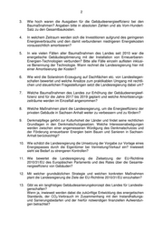 2 3. Wie hoch waren die Ausgaben für die Gebäudeenergieeffizienz bei den Baumaßnahmen? Angaben bitte in absoluten Zahlen und als Vom-Hundert- Satz zu den Gesamtbaukosten. 4. In welchem Zeitraum werden sich die Investitionen aufgrund des geringeren Energieverbrauchs und den damit verbundenen niedrigeren Energiekosten voraussichtlich amortisieren? 5. In wie vielen Fällen aller Baumaßnahmen des Landes seit 2010 war die energetische Gebäudeoptimierung mit der Installation von Erneuerbaren- Energien-Technologien verbunden? Bitte alle Fälle einzeln auflisten inklusi- ve Benennung der Technologie. Wann rechnet die Landesregierung hier mit einer Amortisierung der Kosten? 6. Wie wird die Solarstrom-Erzeugung auf Dachflächen etc. von Landesliegen- schafen bewertet und welche Ansätze zum praktikablen Umgang mit rechtli- chen und steuerlichen Fragestellungen setzt die Landesregierung dabei um? 7. Welche Baumaßnahmen des Landes zur Erhöhung der Gebäudeenergieef- fizienz sind für die Jahre 2017 bis 2019 geplant und welche Amortisierungs- zeiträume werden im Einzelfall angenommen? 8. Welche Maßnahmen plant die Landesregierung, um die Energieeffizienz der privaten Gebäude in Sachsen-Anhalt weiter zu verbessern und zu fördern? 9. Denkmalpflege gehört zur Kulturhoheit der Länder und findet seine rechtlichen Grundlagen in den Denkmalschutzgesetzen. Welche Interessenabwägungen werden zwischen einer angemessenen Würdigung des Denkmalschutzes und der Förderung erneuerbarer Energien beim Bauen und Sanieren in Sachsen- Anhalt berücksichtigt? 10. Wie schätzt die Landesregierung die Umsetzung der Vorgabe zur Vorlage eines Energiepasses durch die Eigentümer bei Vermietung/Verkauf ein? Inwieweit sieht sie Bedarf zu strengeren Kontrollen? 11. Wie bewertet die Landesregierung die Zielsetzung der EU-Richtlinie 2010/31/EU des Europäischen Parlaments und des Rates über die Gesamte- nergieeffizienz von Gebäuden? 12. Mit welcher grundsätzlichen Strategie und welchen konkreten Maßnahmen plant die Landesregierung die Ziele der EU-Richtlinie 2010/31/EU einzuhalten? 13. Gibt es ein langfristiges Gebäudesanierungskonzept des Landes für Landeslie- genschaften? Wenn ja, inwieweit werden dabei die zukünftige Entwicklung des energetischen Standards, der CO2-Verbrauch im Zusammenhang mit den Instandhaltungs- und Sanierungsbedarfen und der hierfür notwendigen finanziellen Aufwendun- gen betrachtet?
