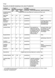 Anlage Personelle und materielle Ausstattung in den unteren Forstbehörden Landkreis/ zu Frage 1 zu Frage 2 kreisfreie Stadt (personelle Ausstattung*) (materielle Ausstattung*) Stellen davon davon Einschätzung Bemerkungen/Begründung geplante Anschaffungen ges.* besetzt unbesetzt Landeshauptstadt Aufgabenwahrnehmung erfolgt durch Landkreis Jerichower Land Magdeburg Stadt Halle 0,4 0,4 0 ausreichend keine (Saale) Stadt Dessau- 1 1 0 ausreichend keine Roßlau Altmarkkreis 3 3 0 ausreichend Ersatzbeschaffung Note- Salzwedel book, GPS-Gerät, Schutzbekleidung Landkreis Anhalt- 1,5 1,5 0 ausreichend Geländefahrzeug Bitterfeld Landkreis Börde 2 0 0 ausreichend Die materielle Aus- technische Geräte, Hard- stattung wird als aus- und Software zur Unter- reichend beurteilt unter stützung der Außen- der Maßgabe, dass die diensttätigkeit, Ersatz Haushaltsansätze für Dienstwagen 2020 und 2021 ge- nehmigt werden. Burgenlandkreis 1 0 0 ausreichend keine Landkreis Harz 4 3,6 0,4 ausreichend geländetaugl. Dienst-Kfz. Landkreis 1 1 0 ausreichend keine Jerichower Land Landkreis 2 2 0 ausreichend Dienst- Mansfeld- /Arbeitsschutzbekleidung, Südharz Fachliteratur Saalekreis 0,6 0,6 0 ausreichend keine Salzlandkreis Aufgabenwahrnehmung erfolgt durch Landkreis Harz Landkreis Stendal 1,55 1,55 0 ausreichend keine Landkreis Witten- 4 4 0 ausreichend materielle Ausstattung keine berg wird als ausreichend eingeschätzt, aller- dings teilweise fehlen- de Dienstkleidung, Ersatzbedarf für ge- ländegängigen Dienstwagen * mit der Aufgabenwahrnehmung als untere Forstbehörden nach § 33 (1) LWaldG beauftragte Bedienstete bzw. Bereiche; (Angaben der Landkreise und kreisfreien Städte) ** Angabe ggf. in Vollzeitäquivalenten