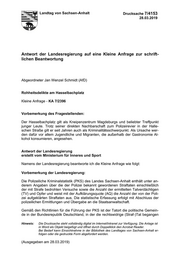 Landtag von Sachsen-Anhalt Drucksache 7/4153 28.03.2019 Antwort der Landesregierung auf eine Kleine Anfrage zur schrift- lichen Beantwortung Abgeordneter Jan Wenzel Schmidt (AfD) Rohheitsdelikte am Hasselbachplatz Kleine Anfrage - KA 7/2396 Vorbemerkung des Fragestellenden: Der Hasselbachplatz gilt als Kneipenzentrum Magdeburgs und beliebter Treffpunkt junger Leute. Trotz seiner direkten Nachbarschaft zum Polizeirevier in der Halle- schen Straße gilt er seit Jahren auch als Kriminalitätsschwerpunkt. Als Ursache wer- den dafür vor allem Jugendliche und Migranten, die außerhalb der Gastronomie Al- kohol konsumieren, angesehen. Antwort der Landesregierung erstellt vom Ministerium für Inneres und Sport Namens der Landesregierung beantworte ich die Kleine Anfrage wie folgt: Vorbemerkung der Landesregierung: Die Polizeiliche Kriminalstatistik (PKS) des Landes Sachsen-Anhalt enthält unter an- derem Angaben über die der Polizei bekannt gewordenen Straftaten einschließlich der mit Strafe bedrohten Versuche sowie die Anzahl der ermittelten Tatverdächtigen (TV) und Opfer und weist mit der Aufklärungsquote (AQ) die Anzahl der von der Poli- zei aufgeklärten Straftaten aus. Die statistische Erfassung erfolgt mit Abschluss der polizeilichen Ermittlungen und Übergabe an die Staatsanwaltschaft. Gemäß den Richtlinien für die Führung der PKS ist der Tatort die politische Gemein- de in der Bundesrepublik Deutschland, in der die rechtswidrige (Straf-)Tat begangen Hinweis: Die Drucksache steht vollständig digital im Internet/Intranet zur Verfügung. Die Anlage ist in Word als Objekt beigefügt und öffnet durch Doppelklick den Acrobat Reader. Bei Bedarf kann Einsichtnahme in der Bibliothek des Landtages von Sachsen-Anhalt er- folgen oder die gedruckte Form abgefordert werden. (Ausgegeben am 28.03.2019)