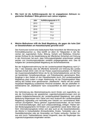 3 3. Wie hoch ist die Aufklärungsquote der im angegebenen Zeitraum re- gistrierten Straftaten? Bitte getrennt nach Jahren angeben. Jahr Aufklärungsquote in % 2013 68,6 2014 72,6 2015 68,4 2016 71,1 2017 71,8 2018 71,5 4. Welche Maßnahmen trifft die Stadt Magdeburg, die gegen die hohe Zahl an Gewaltstraftaten am Hasselbachplatz gerichtet sind? Den Kommunen kommt eine bedeutsame Rolle hinsichtlich der Minimierung der Kriminalitätsursachen zu. Dies betrifft vor allem ihr Tätigwerden in den Be- reichen der Jugendarbeit, Kultur, Bildung, Verkehr und Städtebau. Entschei- denden Einfluss für die Gewährleistung der öffentlichen Sicherheit und Ordnung in den Kommunen hat auch, dass Ordnungswidrigkeiten entschlossen verfolgt werden und Unordnungszuständen verstärkt entgegengetreten wird. Dies ist Aufgabe der Landeshauptstadt Magdeburg als Sicherheitsbehörde. Bei der Aufgabenwahrnehmung hat die Landeshauptstadt Magdeburg nach § 1 Abs. 1 des Gesetzes über die öffentliche Sicherheit und Ordnung des Landes Sachsen-Anhalt (SOG LSA) mit der Polizei zusammenzuarbeiten. Im Rahmen der Zusammenarbeitspflicht führen die für die Sicherheitsbehörde und die Poli- zei handelnden Verwaltungsvollzugs- und Polizeibeamten gemeinsame Strei- fengänge in dem Gebiet um den Hasselbachplatz durch. Die Landeshauptstadt Magdeburg plant zudem in enger Abstimmung mit der Polizeiinspektion Mag- deburg den Aufbau einer gemeinsamen „Stadtwache“. Hierfür will die Landes- hauptstadt Magdeburg zusätzliches Personal einstellen. Mit der pilothaften In- betriebnahme der „Stadtwache“ kann voraussichtlich ab 2020 begonnen wer- den. Die Verhinderung des Alkoholmissbrauchs durch Kinder und Jugendliche, so- wie die Durchsetzung der gesetzlichen Jugendschutzbestimmungen sind ein weiterer Aufgabenschwerpunkt der Landeshauptstadt Magdeburg, dem große Bedeutung beigemessen wird. Daher wird nach Auskunft der Landeshauptstadt Magdeburg regelmäßig und nachhaltig eine Vielzahl von verschiedenen Maß- nahmen durchgeführt. Hierzu gehören Jugendschutzkontrollen, die bei Festen und Großveranstaltungen, aber auch anlassunabhängig, erfolgen. Hierbei wer- den Beratungsgespräche mit Kindern und Jugendlichen sowie deren Eltern ge- führt. Informationsangebote richten sich aber auch an die Gewerbetreibenden, die Alkohol in Verkaufsstellen (Einkaufsmärkte, Kioske, Tankstellen usw.), als Gaststättenbetreiber oder als Veranstalter von Festen verkaufen. Darüber hin- aus wird durch Testkaufaktionen darauf hingewirkt, dass die Regelungen des Jugendschutzgesetzes eingehalten werden.