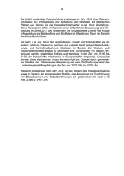 4 Die örtlich zuständige Polizeibehörde erarbeitete im Jahr 2016 eine Rahmen- konzeption zur Verhinderung und Aufklärung von Straftaten auf öffentlichen Plätzen und Wegen für das Hasselbachplatzviertel in der Stadt Magdeburg. Diese Konzeption erfuhr im Rahmen einer fortlaufenden Evaluierung eine An- passung im Jahre 2017 und ist seit dem die konzeptionelle Leitlinie der Polizei in Magdeburg zur Bekämpfung von Straftaten im öffentlichen Raum im Bereich des Hasselbachplatzes. Sie sieht u. a. vor, durch den regelmäßigen Einsatz von Polizeikräften die öf- fentlich sichtbare Präsenz zu erhöhen und zugleich durch zielgerichtete Aufklä- rungs- und Kontrollmaßnahmen Straftaten im Bereich der Straßen- und Rauschgiftkriminalität effektiv zu verhindern bzw. zu verfolgen. Vor diesem Hin- tergrund werden regelmäßig freitags und samstags in der Zeit von 20:00 bis 04:00 Uhr Polizeikräfte mindestens in Gruppenstärke eingesetzt. Unterstützt werden diese Maßnahmen in den Monaten April bis Oktober durch gemeinsa- me Streifen des Polizeireviers Magdeburg mit dem Stadtordnungsdienst der Landeshauptstadt Magdeburg in der Zeit von 20:00 Uhr bis 02:00 Uhr. Weiterhin besteht seit dem Jahr 2008 für den Bereich des Hasselbachplatzes sowie im Bereich der angrenzenden Straßen eine Anordnung zur Durchführung von Bildaufnahmen und Bildaufzeichnungen am gefährlichen Ort nach § 16 Abs. 2 Satz 2 SOG LSA.