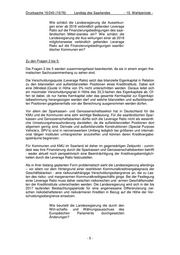 Drucksache 15/243 (15/76) Landtag des Saarlandes - 15. Wahlperiode - Wie schätzt die Landesregierung die Auswirkun- gen einer ab 2018 verbindlich geltenden Leverage Ratio auf die Finanzierungsbedingungen des saar- ländischen Mittel-standes ein? Wie schätzt die Landesregierung die Aus-wirkungen einer ab 2018 möglicherweise verbindlich geltenden Leverage Ratio auf die Finanzierungsbedingungen saarlän- discher Kommunen ein? Zu den Fragen 2 bis 5: Die Fragen 2 bis 5 werden zusammengefasst beantwortet, da sie in einem engen the- matischen Sachzusammenhang zu sehen sind. Die Verschuldungsquote (Leverage Ratio) setzt das bilanzielle Eigenkapital in Relation zu den bilanziellen und außerbilanziellen Positionen eines Kreditinstituts. Dabei soll eine (Mindest-)Quote in Höhe von 3% nicht unterschritten werden. Daraus leitet sich ein maximaler Verschuldungsgrad in Höhe des 33,3-fachen des Eigenkapitals ab. Of- fen ist dabei, ob nur hartes Kernkapital oder das gesamte Kernkapital zur Eigenkapi- talbestimmung herangezogen werden darf und welche bilanziellen und außerbilanziel- len Positionen gegebenenfalls von der Berechnung ausgenommen werden dürfen. Vor allem der Sparkassen- und Genossenschaftssektor hat in Deutschland für die KMU und die Kommunen eine sehr wichtige Bedeutung. Für die saarländischen Spar- kassen und Genossenschaftsbanken dürfte sich die Leverage Ratio nicht als wesentli- che Umsetzungsherausforderung darstellen, da die außerbilanziellen Positionen dort allgemein gering sind. Derivate und außerbilanzielle Konstruktionen (Special Purpose Vehicle’s, SPV’s) sind in nennenswertem Umfang lediglich bei größeren und internati- onal tätigen Instituten umfangreicher anzutreffen und können deren Kreditvergabe- spielräume begrenzen. Für Kommunen und KMU im Saarland ist daher im gegenwärtigen Zeitpunkt - zumin- dest was ihre Finanzierung durch die Sparkassen und Genossenschaftsbanken betrifft - weder aktuell noch perspektivisch eine Beeinträchtigung der Kreditvergabemöglich- keiten durch die Leverage Ratio festzustellen. Als in ihrer bislang geplanten Form problematisch sieht die Landesregierung allerdings – vor allem vor dem Hintergrund einer restriktiven Kommunalkreditvergabepraxis der Geschäftsbanken - eine risikounabhängige Verschuldungsobergrenze an, die zu Las- ten des risiko- und margenarmen Kommunalkreditgeschäfts ginge. Bei der Festlegung einer Leverage Ratio muss daher zwischen risikoreichen und -armen Geschäftsmodel- len der Kreditinstitute unterschieden werden. Die Landesregierung wird sich in der bis 2017 laufenden Beobachtungsperiode für eine angemessene Differenzierung zwi- schen risikobehafteteren und risikoärmeren Krediten in Bezug auf die Höhe der Ver- schuldungsobergrenze einsetzen. Wie beurteilt die Landesregierung die durch den Wirt-schafts- und Währungsausschuss des Europäischen Parlaments durchgesetzten Änderungen? -5-
