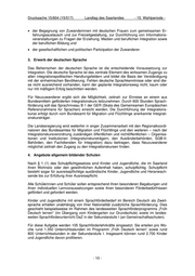 Drucksache 15/604 (15/517) Landtag des Saarlandes - 15. Wahlperiode - Zielgruppen sind arbeitslose Menschen mit Migrationshintergrund (i.d.R. Spätaussied- lerinnen und Spätaussiedler, Eingebürgerte mit weiterhin hohem Integrationsbedarf, Frauen, Senioren, Ungelernte sowie Personen mit geringem Bildungs- und Ausbil- dungsniveau), die schon längere Zeit in Deutschland leben, aber auf Grund von noch vorhandenen Integrationsdefiziten den Zugang zum Arbeitsmarkt noch nicht erreicht haben, beziehungsweise solche Gruppen, die von wirtschaftlichen Strukturveränderun- gen betroffen sind, sodass ihre Arbeitsplätze bedroht oder sie bereits arbeitslos ge- worden sind. Weitere Projektziele sind die Öffnung der Regeldienste, der Aufbau von Ehrenamtsstrukturen, die fachliche Qualifizierung von Ehrenamtlichen und die Einsatz- koordination. 2. Sonstige Integrationsprojekte Neben den landesweit agierenden Integrationsfachdiensten finden Zuwandererfamilien eine Vielzahl von weiteren Integrationsmaßnahmen vor; insbesondere Projekte mit gemeinwesenorientiertem Charakter. Dazu gehören Projekte, die • zur interkulturellen Öffnung von öffentlichen und nichtöffentlichen Organisationen und Institutionen beitragen, • Ehrenamtsstrukturen aufbauen und begleiten, • Kinder, Jugendliche und Frauen als besondere Zielgruppe ausweisen, • das Zusammenleben im Gemeinwesen fördern, • Integrationshindernisse vor allem im Bereich Fremdenfeindlichkeit und Extremismus abbauen, • Begegnungen von einheimischer und zugewanderter Bevölkerung fördern, • Beratung in migrationsspezifisch bedingten Konfliktsituationen anbieten und • die Bildungschancen zugewanderter Kinder fördern. Diese Projekte dienen insbesondere • der Information und Beratung aller gesellschaftlichen Gruppen, Organisationen, In- stitutionen und Einzelpersonen zu Fragen der Einwanderung und der vielfältigen Facetten von Rassismus und Fremdenfeindlichkeit, • dem Zusammenleben der unterschiedlichen Kulturen und Nationalitäten in der Ge- sellschaft und der Familie durch Beratung sowie Begegnung und Information in Form von praxisorientierten Veranstaltungen und Informationen über die hier leben- den Minderheiten sowie der Beratung, • der Begegnung von Jungen und Mädchen deutscher und nichtdeutscher Herkunft durch regelmäßige Treffen und gemeinsame Freizeitangebote im Rahmen interkul- tureller Jugendsozialarbeit sowie der individuellen Beratung und Hilfe bei persönli- chen und schulischen Problemen, im Freundes- und Familienkreis, in der Ausbil- dung, bei Diskriminierungsfällen, bei der Berufswahl usw., • der Schaffung gegenseitiger Akzeptanz und Toleranz zwischen den Nationalitäten im Rahmen der offenen Jugendarbeit sowie der Zusammenarbeit mit den Familien- angehörigen und der Kooperation mit den Schulen, • in Bereichen mit einem hohen Zuwandereranteil der Eltern- und Familienberatung bei Problemen im Kindergarten und in der Schule, der Sprachförderung von Zuwan- dererkindern im Vorschulalter sowie interkultureller Lernprozesse durch Öffentlich- keitsarbeit zur Verbesserung des Zusammenlebens im Gemeinwesen, -9-