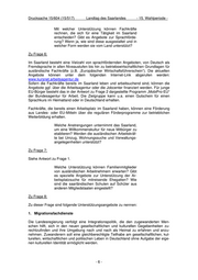 Drucksache 15/604 (15/517) Landtag des Saarlandes - 15. Wahlperiode - Mit welcher Unterstützung können Fachkräfte rechnen, die sich für eine Tätigkeit im Saarland entscheiden? Gibt es Angebote zur Sprachförde- rung? Wenn ja, wie sind diese ausgestaltet und in welcher Form werden sie vom Land unterstützt? Zu Frage 6: Im Saarland besteht eine Vielzahl von sprachfördernden Angeboten, von Deutsch als Fremdsprache in allen Niveaustufen bis hin zu betriebswirtschaftlichen Grundlagen für ausländische Fachkräfte (z.B. „Europäischer Wirtschaftsführerschein“). Die aktuellen Angebote können unter dem folgenden Internet-Link abgerufen werden: www.kursnet.arbeitsagentur.de Sofern die Fachkräfte bereits im Saarland leben und arbeitsuchend sind, können die Angebote ggf. über die Arbeitsagentur oder die Jobcenter finanziert werden. Für junge EU-Bürger besteht das in der Antwort zu Frage 2 dargestellte Programm „MobiPro-EU“ der Bundesagentur für Arbeit. Die Zielgruppe kann u.a. einen Gutschein für einen Sprachkurs im Heimatland oder in Deutschland erhalten. Fachkräfte, die bereits einen Arbeitsplatz im Saarland haben, können eine Förderung aus Landes- oder EU-Mitteln über die regulären Förderprogramme zur betrieblichen Weiterbildung erhalten. Welche Anstrengungen unternimmt das Saarland, um eine Willkommenskultur für neue Mitbürger zu etablieren? Werden die ausländischen Arbeitskräf- te bei Umzug, Wohnungssuche und Verwaltungs- angelegenheiten unterstützt? Zu Frage 7: Siehe Antwort zu Frage 1. Welche Unterstützung können Familienmitglieder von ausländischen Arbeitnehmern erwarten? Gibt es spezielle Angebote zur Unterstützung der Ar- beitsplatzsuche für mitreisende Ehegatten? Wie sind die saarländischen Schulen auf Schüler aus anderen Mitgliedstaaten eingestellt? Zu Frage 8: Zu dieser Frage sind folgende Unterstützungsangebote zu nennen: 1. Migrationsfachdienste Die Landesregierung verfolgt eine Integrationspolitik, die den zugewanderten Men- schen hilft, sich in den neuen gesellschaftlichen und kulturellen Gegebenheiten zu- rechtzufinden und ihre Umgebung nach und nach als Heimat zu erfahren und anzu- nehmen. Zuwanderern soll eine gleichberechtigte Teilhabe am gesellschaftlichen, kul- turellen, wirtschaftlichen und politischen Leben in Deutschland ohne Aufgabe der eige- nen kulturellen Identität ermöglicht werden. -6-