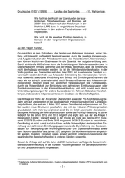 Drucksache 15/937 (15/826) Landtag des Saarlandes - 15. Wahlperiode - Wie hoch ist die Anzahl der Überstunden der saar- ländischen Polizeibeamtinnen und Beamten seit 2009? Bitte auflisten nach den Abteilungen in der Direktion LPP2 bzw. in vergleichbare Organisati- onseinheiten in den anderen Fachdirektionen und Inspektionen. Wie hoch ist die jeweilige Pro-Kopf-Belastung in Stunden in den vorgenannten Organisationsein- heiten? Zu den Fragen 1 und 2: Grundsätzlich ist dem Polizeiberuf das Leisten von Mehrdienst immanent, wobei Um- fang und Intensität maßgeblich bestimmt werden durch die jeweilige Verwendungs- und Aufgabensituation der Polizeibeamtin oder des Polizeibeamten. Mehrdienststun- den können letztlich ein Gradmesser für die Quantität der Aufgabenerfüllung sein. Durch strukturelle Maßnahmen kann die Entwicklung von Mehrdienststunden zwar in überschaubarem Umfang gebremst und der Abbau beeinflusst, aber die Entstehung nicht durchgängig vermieden werden. So ist die Mehrdienststundensituation in der Vollzugspolizei des Saarlandes seit dem Jahr 2001 mit zunehmender Tendenz u.a. verursacht worden durch die aus Anlass der Entwicklung des internationalen Terroris- mus notwendig gewordene Verstärkung von Schutz- und Ermittlungsmaßnahmen, die nach wie vor aufrecht zu erhalten sind, durch Einsatzmaßnahmen aus Anlass von de- monstrativen Aktionen sowie von sportlichen Veranstaltungen wie Fußballspielen, durch die Notwendigkeit zur Einrichtung von zahlreichen Ermittlungsgruppen oder Sonderkommissionen in der Kriminalitätsbekämpfung und nicht zuletzt auch durch Unterstützungsleistungen für andere Bundesländer im Rahmen föderativer Verpflich- tungen, insbesondere mit personalintensiven Einsätzen der Bereitschaftspolizei. Die Anfrage zur Höhe der Anzahl der Überstunden sowie der Pro-Kopf-Belastung be- zieht sich auf Dienststellen in der gegenwärtigen Polizeiorganisation des Landespoli- zeipräsidiums, das erst am 1. März 2012 seinen Dienstbetrieb aufgenommen hat. Da- bei wurden neue Strukturen geschaffen, die mit der früheren Polizeiorganisation grundsätzlich nicht mehr zu vergleichen sind. Die im Detail gewünschte dienststellen- bezogene Auflistung der Mehrarbeitsstunden sowie die Pro-Kopf-Belastung ist daher lediglich für die Jahre 2012 und 2013 möglich und ergibt sich aus der als Anlage 1 1 beigefügten Tabelle . Danach waren in der Polizei am Ende des Jahres 2012 insge- samt 232.076 Stunden und Ende 2013 insgesamt 242.913 Stunden zu verzeichnen. Der Anstieg ist nicht zuletzt zurückzuführen auf die Notwendigkeit der temporären Ein- richtung von zahlreichen Ermittlungsgruppen sowie die Durchführung von Sonderein- sätzen zur Bekämpfung der Wohnungseinbruchs- und Eigentumskriminalität sowie dem Novum, dass Mitte des Jahres 2013 zeitgleich fünf Mordkommissionen eingerich- tet werden mussten. Daneben waren erneut verstärkt Unterstützungseinsätze der saarländischen Bereitschaftspolizei in anderen Ländern notwendig. Soweit die Anfrage sich auf die Jahre ab 2009 bezieht wird auf folgende Gesamtmehr- dienststundenentwicklung in der früheren Polizeiorganisation mit Landespolizeidirekti- on und Landeskriminalamt hingewiesen: 1 Tabellarische Auflistung Mehrarbeitsstunden – Quelle: Landespolizeipräsidium, Direktion LPP 3 Personal/Recht, vom 17.04.2014 -2-