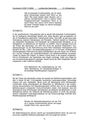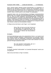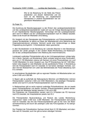 Drucksache 15/937 (15/826) Landtag des Saarlandes - 15. Wahlperiode - Davon unberührt bleiben allerdings situative Entscheidungen von Vorgesetzten zur Begrenzung der Mehrarbeit im Einzelfall im Rahmen der Fürsorgepflicht, wenn er- kennbar ist, dass eine Polizeibeamtin oder ein Polizeibeamter die Grenzen physischer und psychischer Belastungen erreicht und ein weiterer Einsatz nicht mehr zumutbar erscheint. Darauf zu achten, gehört zu den wichtigen Führungsaufgaben. Ungeachtet dessen sieht unter Berücksichtigung einschlägiger arbeitszeitrechtlicher Bestimmungen eine vorläufige Rahmendienstzeitregelung für das Landespolizeipräsi- dium vor, dass die Anzahl vorgeplanter Wochenenddienststunden innerhalb eines Fünf-Wochen-Zeitraums 70 Stunden nicht überschreiten darf. Dabei ist im Planungs- zeitraum mindestens ein dienstfreies Wochenende ohne Wochenenddienststunden zu gewähren. Diese Regelung bezieht sich allerdings auf vorausplanbare Dienste und beschränkt nicht die kurzfristige Anordnung von Mehrarbeit aus zwingenden dienstli- chen Gründen vor allem bei unvorhersehbaren Anlässen. Im Übrigen wird auf die Antwort zu den Fragen 1 und 2 hingewiesen. Gibt es Fälle und wenn ja wie viele, bei denen es bei Übermüdung nach Dienstschluss oder wäh- rend des Dienstes zu Unfällen kam? Wenn ja, wie wurden diese im Rahmen des Dienstunfallschut- zes geregelt? Zu Frage 8: Alle Dienstunfallmeldungen gehen dem polizeiärztlichen Dienst zu und werden durch den Polizeiarzt bezüglich Unfallablauf, Unfallmechanismus und eventueller medizini- scher Ursachen sowie auch diesbezüglich resultierender Verletzungsfolgen geprüft. Übermüdung als Ursache eines Dienstunfalls ist bisher weder akklamiert noch durch genannte Prüfungen substantiiert worden. Wie viele bewertete Funktionsstellen gibt es in den Fachdirektionen und Inspektionen? Zu Frage 9: Die Begriffe „bewertete Funktionsstellen“ und „bewertete Dienstposten“ werden syno- nym gebraucht. Daher wird auf die Antwort zu Frage 13 verwiesen. -5-