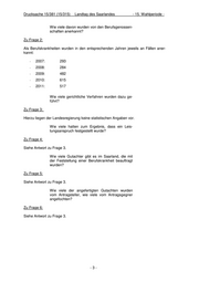 Drucksache 15/381 (15/315) Landtag des Saarlandes - 15. Wahlperiode - Wie viele davon wurden von den Berufsgenossen- schaften anerkannt? Zu Frage 2: Als Berufskrankheiten wurden in den entsprechenden Jahren jeweils an Fällen aner- kannt: - 2007: 293 - 2008: 284 - 2009: 482 - 2010: 615 - 2011: 517 Wie viele gerichtliche Verfahren wurden dazu ge- führt? Zu Frage 3: Hierzu liegen der Landesregierung keine statistischen Angaben vor. Wie viele hatten zum Ergebnis, dass ein Leis- tungsanspruch festgestellt wurde? Zu Frage 4: Siehe Antwort zu Frage 3. Wie viele Gutachter gibt es im Saarland, die mit der Feststellung einer Berufskrankheit beauftragt wurden? Zu Frage 5: Siehe Antwort zu Frage 3. Wie viele der angefertigten Gutachten wurden vom Antragsteller, wie viele vom Antragsgegner angefochten? Zu Frage 6: Siehe Antwort zu Frage 3. -3-