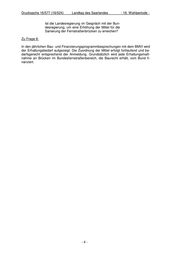 Drucksache 16/577 (16/524) Landtag des Saarlandes - 16. Wahlperiode - Ist die Landesregierung im Gespräch mit der Bun- desregierung, um eine Erhöhung der Mittel für die Sanierung der Fernstraßenbrücken zu erreichen? Zu Frage 6: In den jährlichen Bau- und Finanzierungsprogrammbesprechungen mit dem BMVI wird der Erhaltungsbedarf aufgezeigt. Die Zuordnung der Mittel erfolgt fortlaufend und be- darfsgerecht entsprechend der Anmeldung. Grundsätzlich wird jede Erhaltungsmaß- nahme an Brücken im Bundesfernstraßenbereich, die Baurecht erhält, vom Bund fi- nanziert. -4-