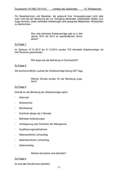 Drucksache 15/1485 (15/1410) Landtag des Saarlandes - 15. Wahlperiode - Für Bewerberinnen und Bewerber, die aufgrund ihrer Voraussetzungen nicht oder noch nicht bei der Besetzung der zur Verfügung stehenden unbefristeten Stellen zum Zuge kommen, bieten befristete Anstellungen eine geeignete Möglichkeit, Wartezeiten zu überbrücken. Wie viele befristete Arbeitsverträge gab es in den Jahren 2012 bis 2014 im saarländischen Schul- dienst? Zu Frage 1: Im Zeitraum 01.01.2012 bis 31.12.2014 wurden 572 befristete Arbeitsverträge mit 244 Personen geschlossen. Wie lange war die Befristung im Durchschnitt? Zu Frage 2: Die durchschnittliche Laufzeit der Arbeitsverträge betrug 235 Tage. Welche Gründe wurden für die Befristung ange- führt? Zu Frage 3: Gründe für die Befristung der Arbeitsverträge waren: - Elternzeit - Mutterschutz - Beurlaubung - Krankheit (länger als 2 Monate) - Befristete Aufstockungen - Verlängerung nach Erreichen der Altersgrenze - Qualifizierungsmaßnahmen - Nebenamtlicher Lehrauftrag - Nebenberuflicher Lehrauftrag - Seiteneinstieg Welche Schularten sind betroffen? Zu Frage 4: Es sind alle Schulformen betroffen. -2-